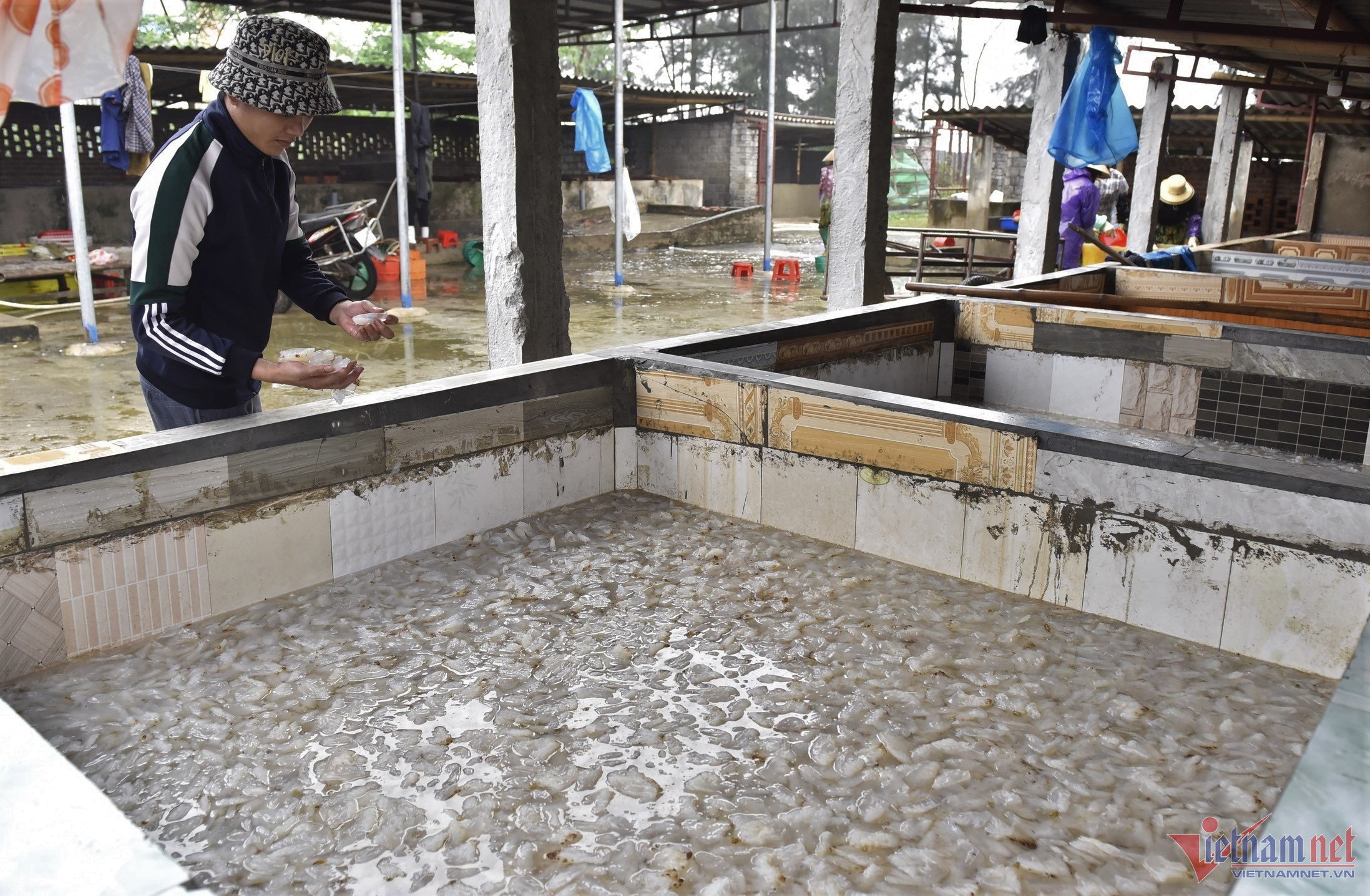 Công đoạn sơ chế, sứa được cho vào các bể xi măng ngâm với nước, muối, phèn với độ mặn thích hợp để đảm bảo sản phẩm sứa thành phẩm sạch, dai, giòn.