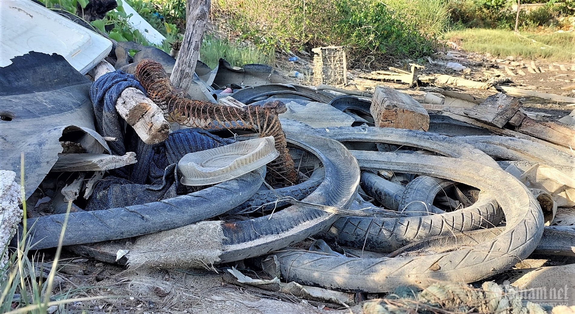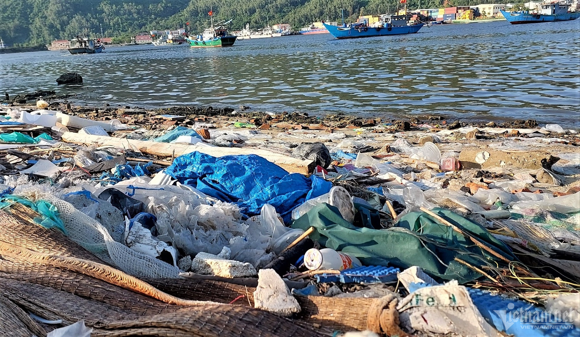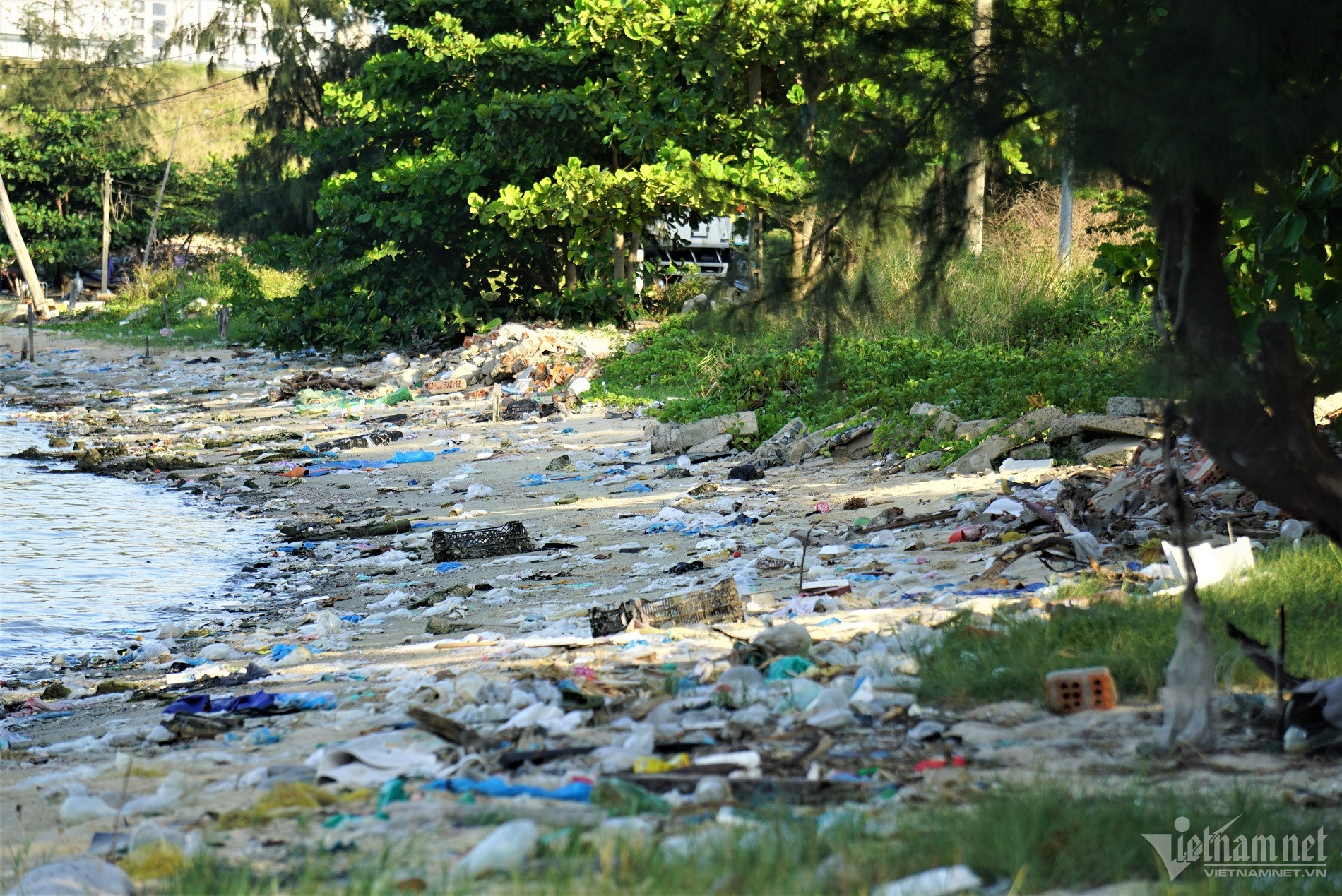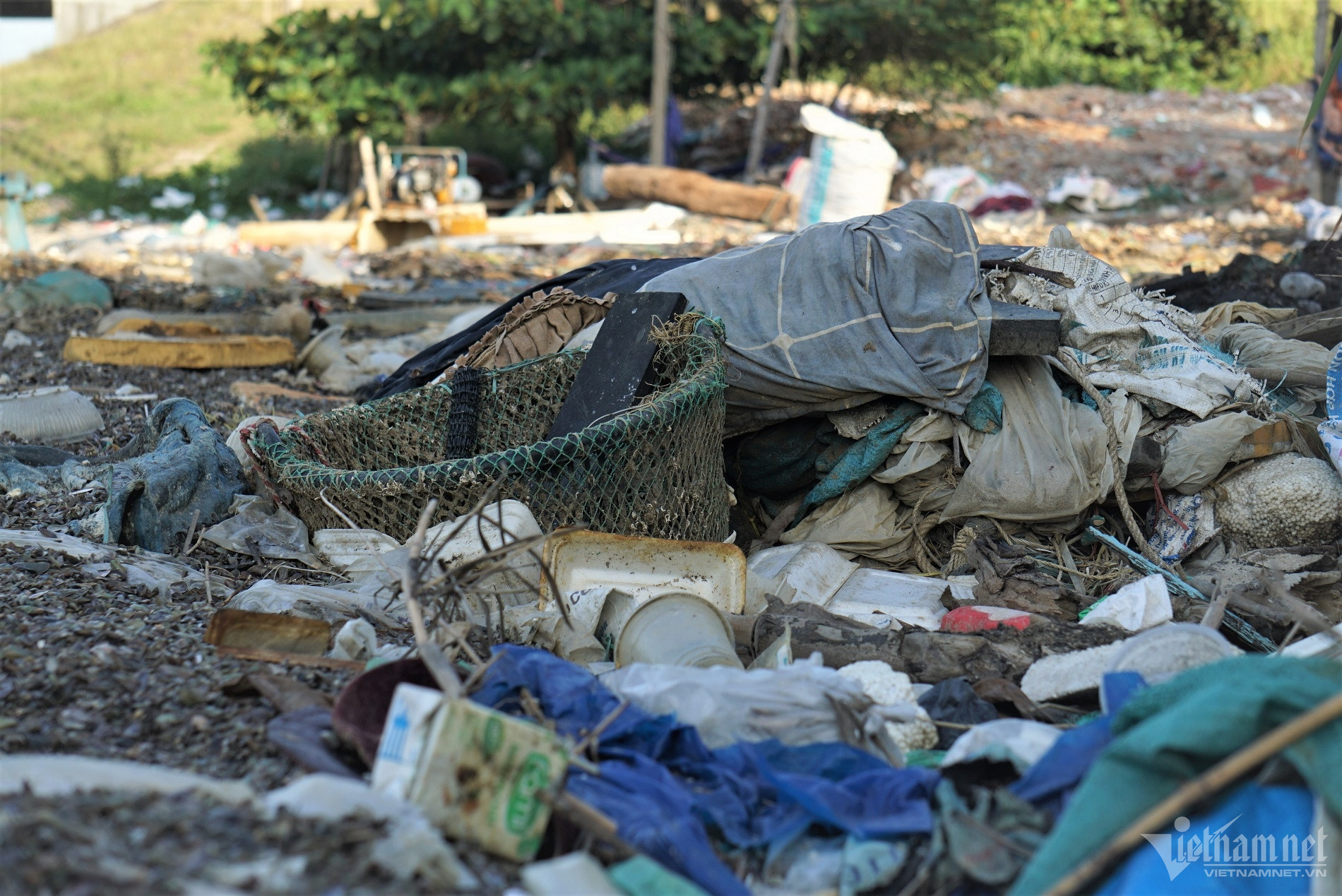 Đủ loại rác thải từ bao nylon, chai nhựa, thùng xốp bị sóng đánh tấp vào bờ nhưng không được dọn dẹp, tạo nên hình ảnh nhếch nhác.