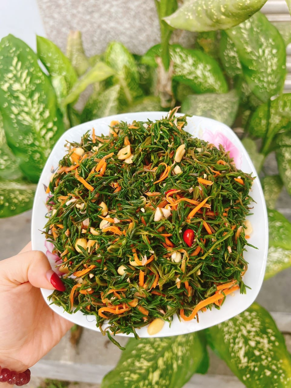 Đầu bếp tiếp tục vắt thật kỹ cho rau ráo nước, rồi dùng đũa đánh rau tơi ra. Rau nhót sẽ được trộn đều với lạc rang, cà rốt thái sợi, giá đỗ, lá chanh, ớt cay, tỏi, nước cốt chanh, chút đường.