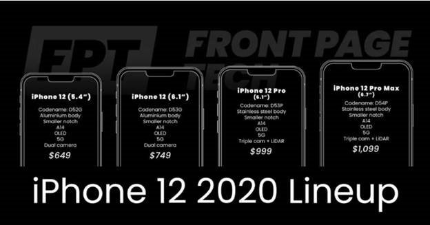 Thông tin về kích thước màn hình và giá cả tại thị trường Mỹ cũng được tiết lộ, cụ thể: iPhone 12 (Mini) có màn hình 5,4 inch và có giá 649 USD; iPhone 12 (Plus /Max) có màn hình 6,1 inch và có giá 749 USD; iPhone 12 Pro có màn hình 6,1 inch và có giá 999 USD và cuối cùng là iPhone 12 Pro Max có màn hình 6,7 inch và có giá 1.099 USD.
