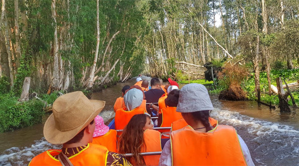 Buổi trưa, du khách khám phá rừng tràm Trà Sư với nhiều loài động, thực vật quý hiếm, những đàn cò làm tổ... Du khách sẽ được trải nghiệm cảm giác đi bằng xuồng len lỏi qua các kênh rạch nhỏ và tán rừng tràm để tham quan hệ sinh thái đa dạng và đặc trưng của rừng ngập nước.