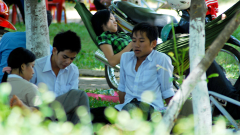 - Giờ nghỉ giữa buổi thi môn Toán và Vật lí, ghế đá, công viên, lề đường, bất cứ nơi nào có bóng mát, các thí sinh