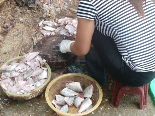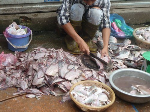 | Cá được lọc ở chợ khi người mua hàng đã vãn. |