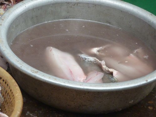 | Khi đã lọc xong, tất cả cá được rửa qua loa trong chậu nước này |