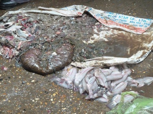 | Những người buôn cá đã tận dụng những loại cá nhỏ đã ươn thối thế này để lọc lấy thịt giao cho những của hàng bán bún cá. (Ảnh chụp trong khu chợ ở Cầu Giấy, Hà Nội). |