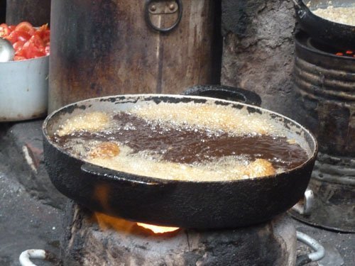 | Tại cửa hàng bún, thịt cá được tẩm ướp kỹ với gia vị và được rán giòn trong chảo dầu, mỡ dầu mỡ đã chuyển màu đặc sánh thế này |