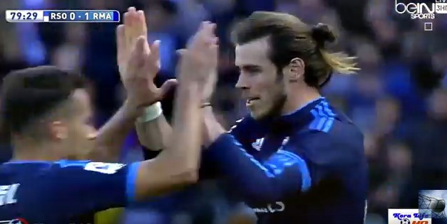 BÀN THẮNG: Sau nhiều cơ hội bị bỏ lỡ, cuối cùng Real cũng có được bàn thắng khai thông thế bế tắc. Đón đường chuyền của Lucas Vazquez bên cánh phải, Bale bật cao đánh đầu tung lưới Sociedad, mở tỷ số trận đấu.