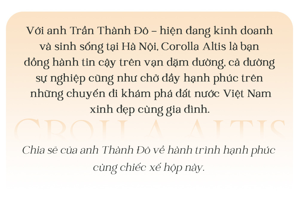 Với tôi, Corolla Altis là bạn đồng hành tin cậy trên vạn dặm đường, cả đường công danh sự nghiệp cũng như chở đầy hạnh phúc trên những con đường khám phá đất nước Việt Nam xinh đẹp.