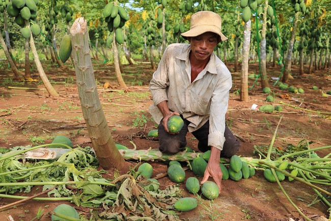 Cặm cụi gom từng trái đu đủ nằm vương vãi dưới đất để bán, mong vớt vát lại chút chi phí, ông Lợi cho hay, vườn đu đủ này được ông thuê để canh tác trên diện tích 3 sào đất, tại thôn Phước Trung (xã Đá Bạc, huyện Châu Đức, tỉnh Bà Rịa - Vũng Tàu).