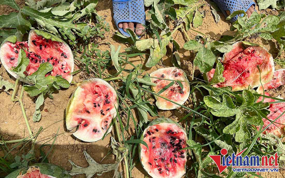 Ruộng dưa hấu của ông Tôn rộng hơn 500m2, trong đó khoảng 200m2 bị kẻ gian hái quả lấy đi và phá nát, chỉ còn lại những quả dưa hấu từ 1-1,5kg bị phá nát nằm lăn lóc giữa ruộng.