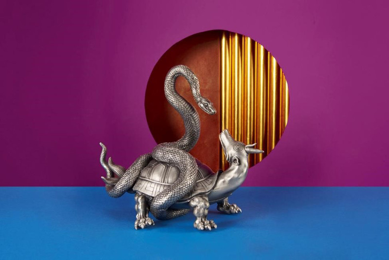 Là linh vật huyền thoại đặc biệt nhất trong Tứ Tượng, Huyền Vũ mang tạo hình siêu thực của hình tượng rùa và rắn quấn lấy nhau. Hai linh vật giao hòa không xung đột, như đang giao lưu bằng ánh mắt hòa hợp, càng gia tăng vẻ huyền bí cho tác phẩm điêu khắc. Huyền Vũ đại diện của mùa Đông, khung giờ nửa đêm và hành Thủy, cai quản về tuổi thọ, vận mệnh, may mắn và phúc lộc.