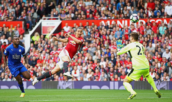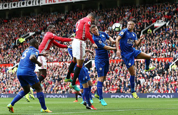 Hàng thủ Leicester hoàn toàn sụp đổ. Vẫn là tình huống phạt góc bên cánh trái, Blind tạt dẻo cho Pogba bay người đánh đầu ghi bàn thứ 4 cho MU.