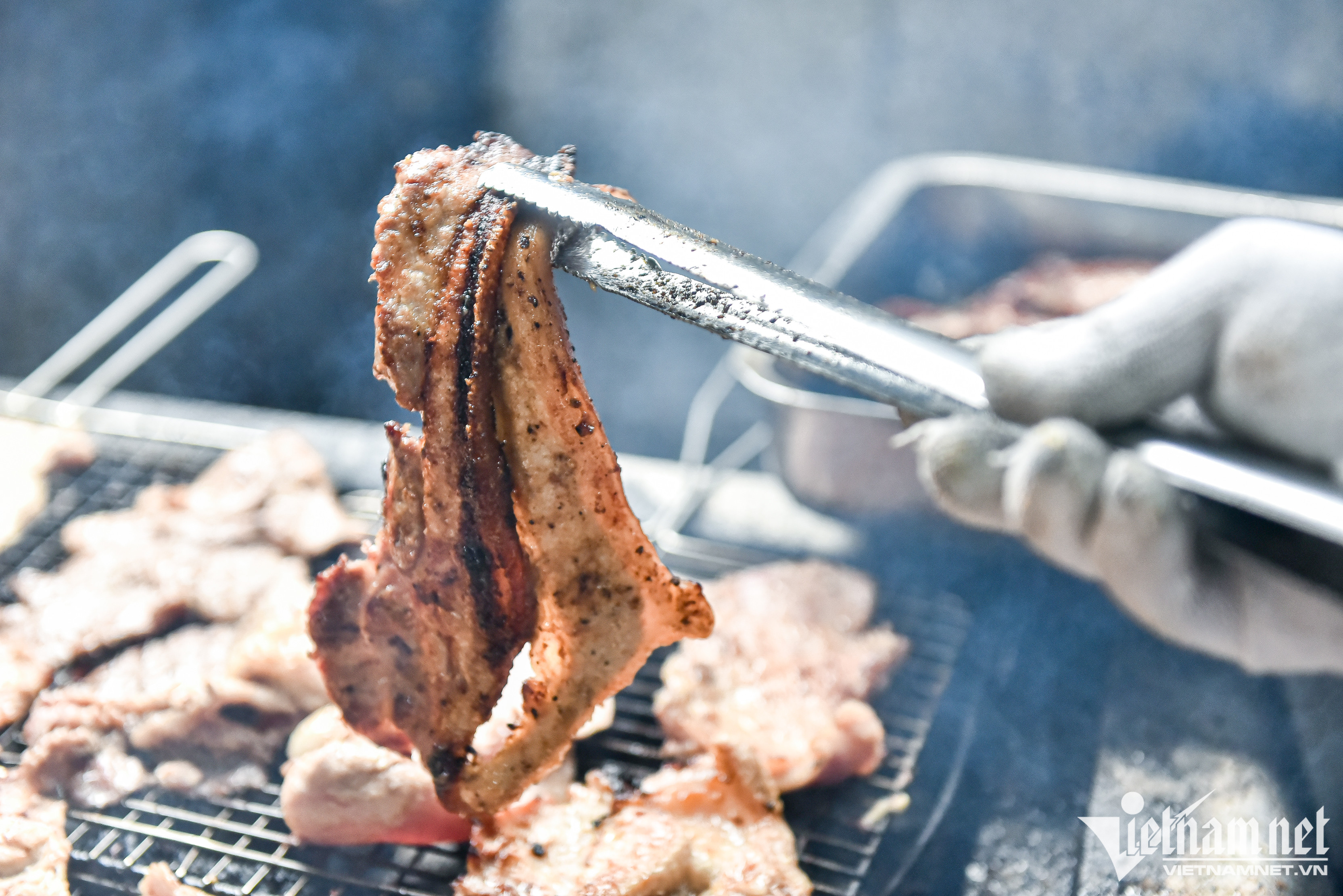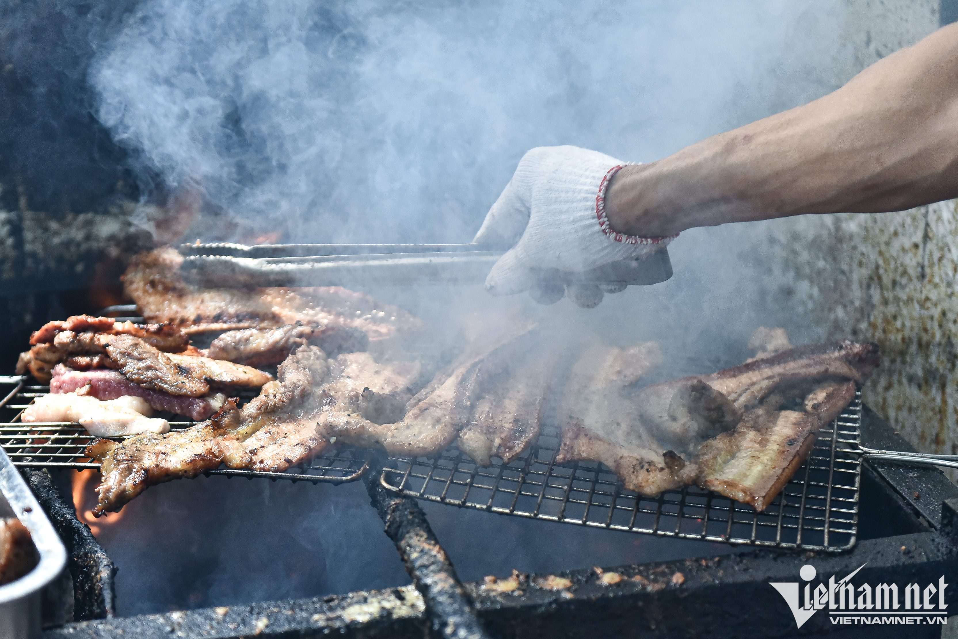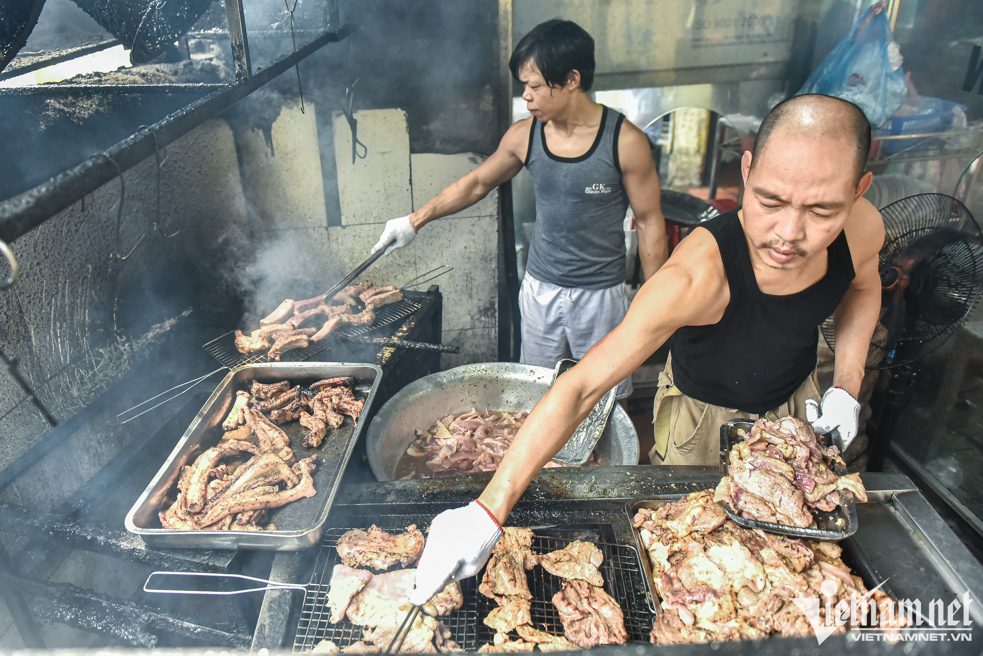 Khu vực nướng thịt của quán lúc nào cũng nghi ngút khói. Thịt, sườn nướng tới đâu, bán tới đó, chủ quán không nướng sớm khiến miếng thịt bị khô. Anh Toàn trực tiếp đứng bếp bởi theo anh: "Công đoạn này rất quan trọng, mình phải căn nhiệt độ vừa đủ để miếng thịt chín đều, vàng màu cánh gián, nhưng không bị cháy. Nhà tôi đến nay vẫn dùng than thay vì nướng máy"