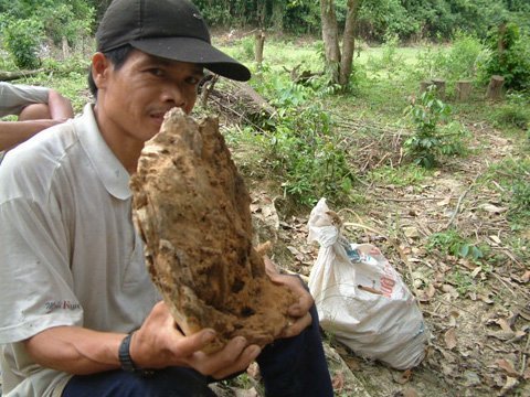Một phu trầm giữa rừng thẳm khoe chiến lợi phẩm sau khi tìm được.