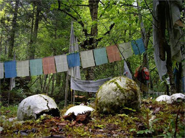 những cao tăng được thổ táng. Trên núi có rất nhiều cờ phướn, nhiều đầu lâu rơi