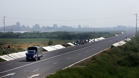 Công đoạn “tẩm bụi” được thực hiện trên đường đê tấp nập các loại phương tiên giao thông, đặc biệt nhiều xe tải.