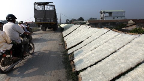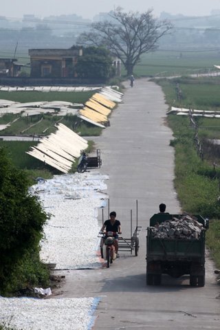 Ô tô tải chạy làm bụi mù liên tục trên đường, nhưng miến ướt vẫn được phơi ngay sát cạnh. Chỉ cần so mầu mẻ miến mới phơi và phơi được một buổi cũng thấy đen hơn hẳn vì dính bụi bẩn.