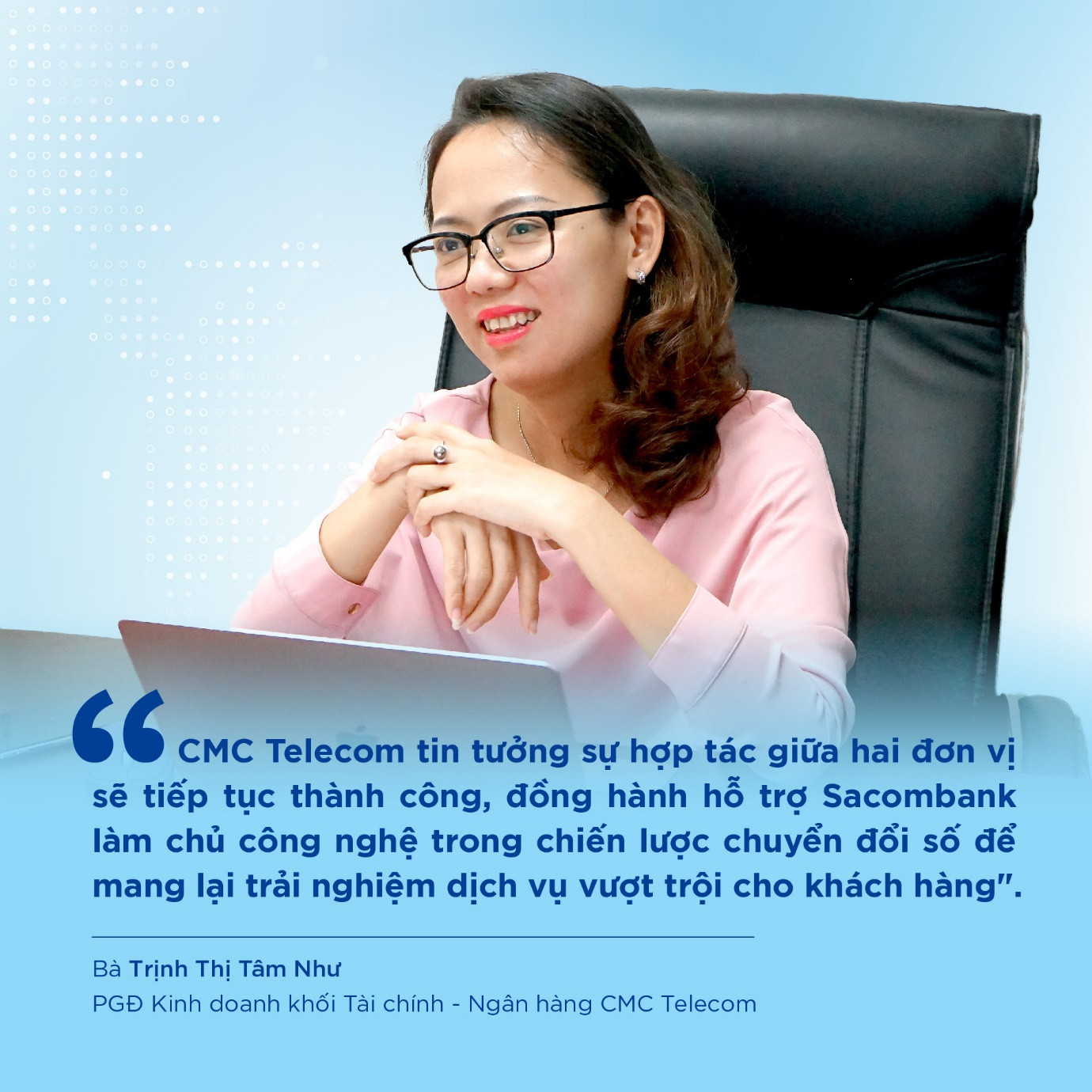 Bà Trịnh Thị Tâm Như, Phó Giám đốc Kinh doanh khối Tài chính - Ngân hàng CMC Telecom chia sẻ: “Sacombank là một khách hàng có đội ngũ nhân sự công nghệ thông tin mạnh, chuyên môn rất cao và có định hướng chuyển đổi số rất rõ ràng. Với kinh nghiệm 15 năm phục vụ cho phân khúc khách hàng Tài chính, Ngân hàng, CMC Telecom tin tưởng sự hợp tác giữa hai đơn vị sẽ tiếp tục thành công, đồng hành hỗ trợ Sacombank làm chủ công nghệ trong chiến lược chuyển đổi số để mang lại trải nghiệm dịch vụ vượt trội cho khách hàng.”