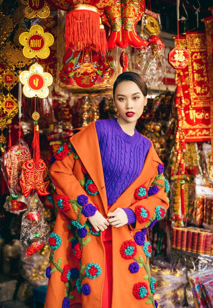 Người mẫu chụp ảnh bên gian hàng bán vật phẩm trang trí Tết. Áo khoác với len sợi đan thành những cánh hoa phù hợp dạo phố trong tiết trời se lạnh.