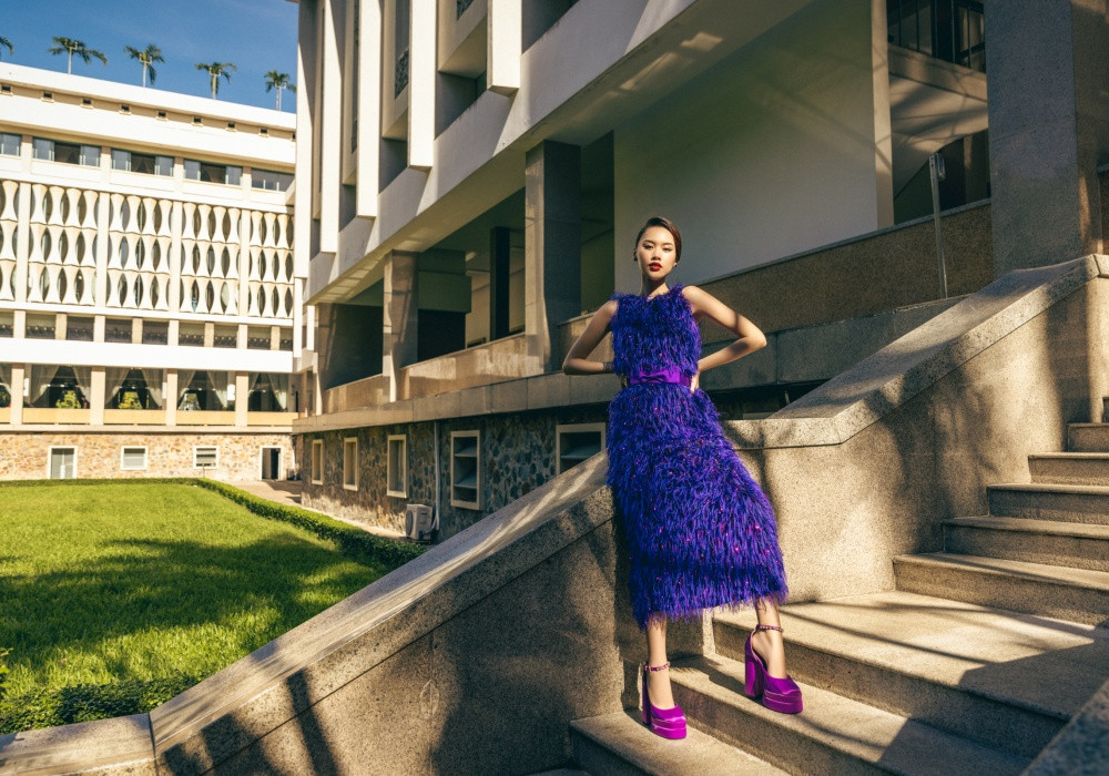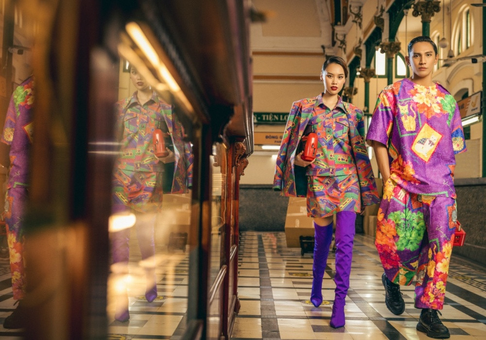 Ngoài các bộ đầm suông, NTK cũng kỳ công may váy xếp bồng nhiều lớp. Các thiết kế đa dạng về phom dáng, phù hợp diện trong các sự kiện, lễ hội. Sắc đỏ làm nổi bật một góc chợ Bến Thành. Đây cũng là địa điểm quen thuộc đối với du khách trong và ngoài nước mỗi khi có dịp ghé thăm Sài Gòn. Họa tiết linh vật mèo của năm Quý Mão 2023 được nhà mốt đưa lên váy áo. Cảm hứng vui sống là thông điệp từ bộ sưu tập được chuyển tải qua những gam màu phối sống động, tạo tổng thể bắt mắt. Sắc tím là tông chủ đạo của bộ sưu tập, đồng thời hợp xu hướng thời trang quốc tế.
