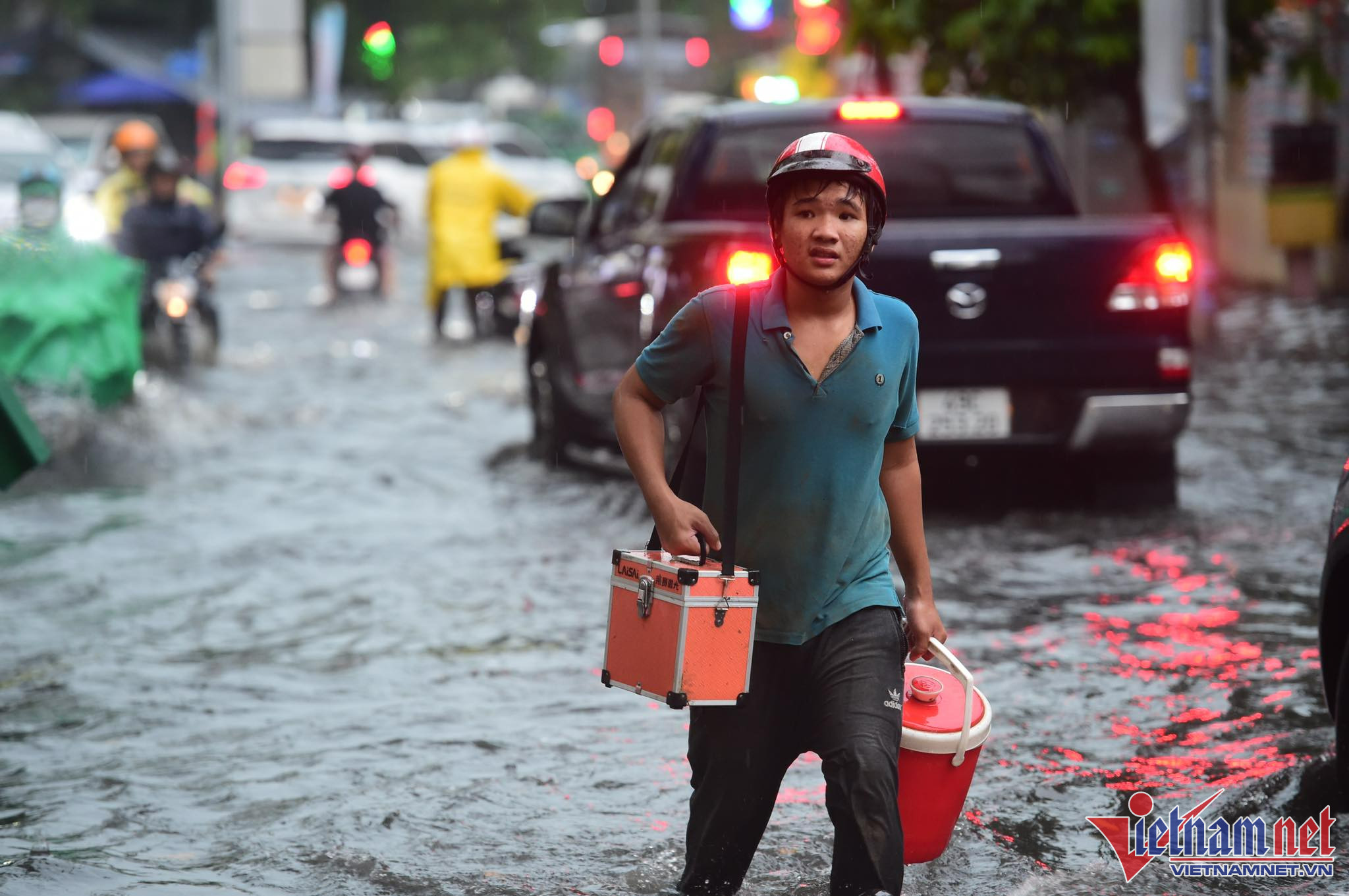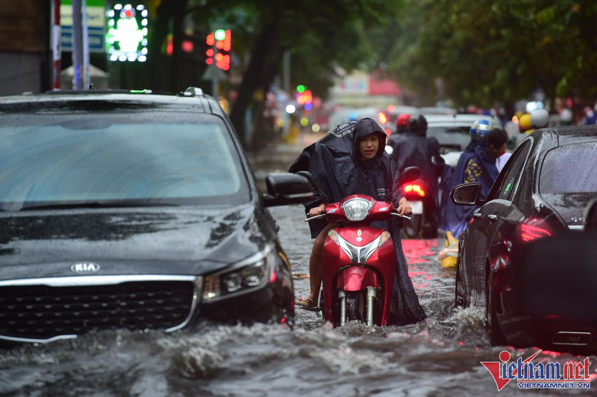 Nhiều người cố chạy qua chỗ nước sâu, dẫn đến tình trạng phương tiện chết máy phải dắt bộ.