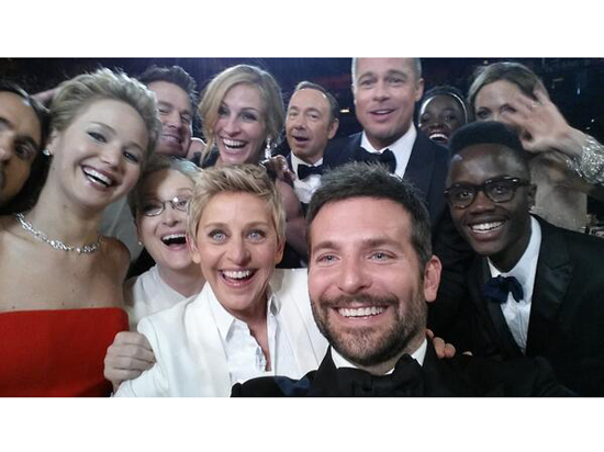 Sau đó, cô lại dùng Note 3 để chụp ảnh “tự sướng” tập thể cùng dàn diễn viên tài năng đang ngồi hàng ghế khán giả như Bradley Cooper, Jennifer Lawrence, Kevin Spacey… Lần này, với sự trợ giúp của Cooper, bức ảnh có chất lượng tốt hơn nhiều và thậm chí còn trở thành tin tweet được đăng lại nhiều nhất lịch sử Twitter.
