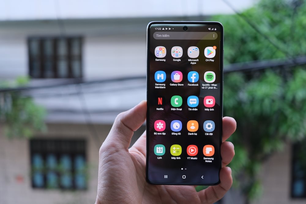 Dù màn hình to nhưng việc áp dụng tỉ lệ dài 20:9 giúp thân máy gọn về chiều ngang nên việc cầm nắm dễ chịu bằng một tay. Phần viền quanh màn hình của Galaxy A71 được dát mỏng với viền dưới hơi dày hơn. Khu vực “nốt ruồi” chứa camera selfie 32MP của máy được làm khá gọn và không che khuất quá nhiều chi tiết khi hiển thị nội dung.