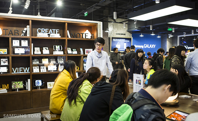 Cửa hàng mới chia thành 5 khu độc lập: Product Experience Zone (trải nghiệm sản phẩm), Galaxy Lab (phòng thí nghiệm), Galaxy Music (âm nhạc), Galaxy Accessories (phụ kiện), Concierge (chăm sóc khách hàng). Khách hàng có thể nghe nhạc bằng tai nghe Level, đọc tạp chí trên Galaxy Tab S hay thưởng thức café miễn phí khi mua Galaxy Note 4.