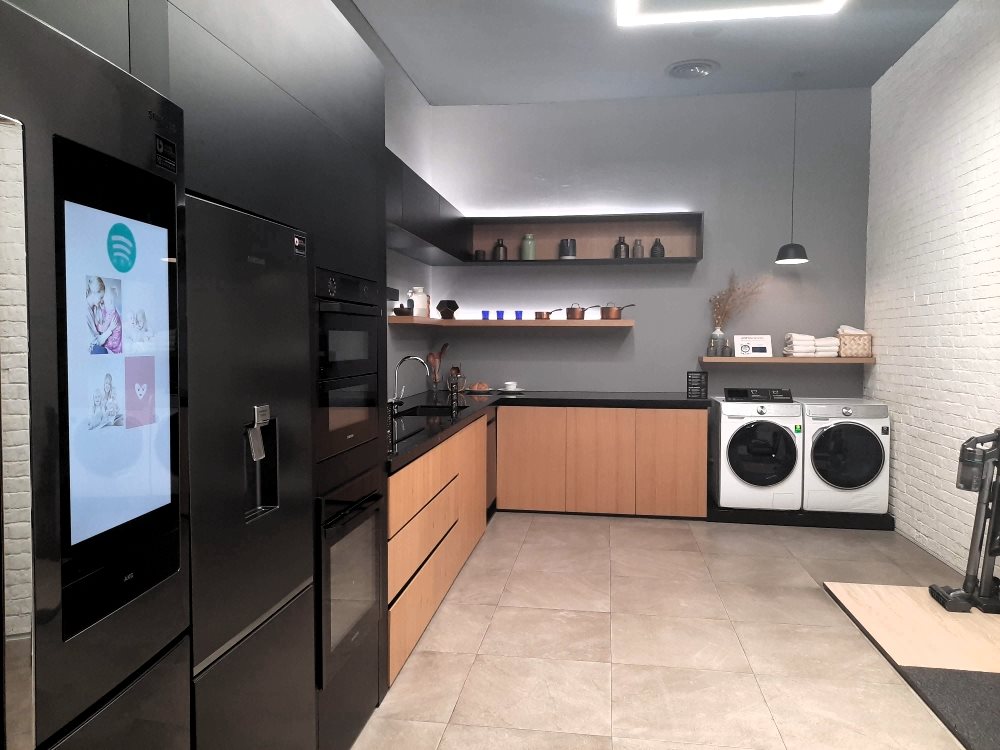 Nhà bếp với tủ lạnh, máy giặt, đèn cùng với nhiều cảm biến thông minh được lắp đật và kết nối với SmartThings. |
