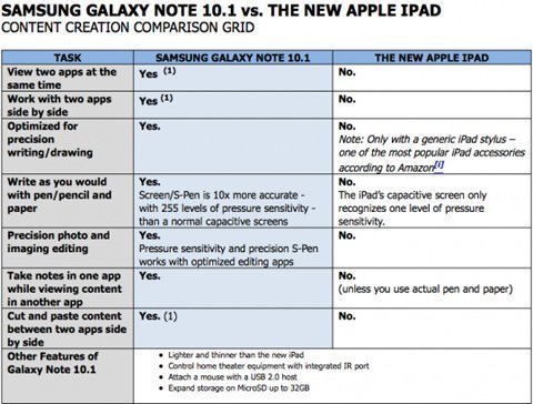 Một bảng thống kê những khả năng mà Galaxy Note 10.1 có thể trong khi đối với chiếc iPad mới nhất của Apple là không thể được hãng này đưa ra. Theo Samsung thì Galaxy Note 10.1 có thể chạy hoặc xem hai ứng dụng cùng lúc trong khi iPad không làm được, Note hơn iPad khả năng viết và vẽ với chiếc bút S-Pen tiện dụng và độc đáo, khả năng chỉnh sửa ảnh một cách chính xác, lưu ghi chú bằng một ứng dụng và xem nội dung trên một ứng dụng khác, cắt và dán nội dung giữa hai ứng dụng cũng là những điểm được Samsung đem ra so sánh.