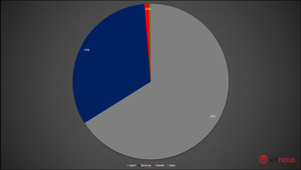 Thống kê của GfK tháng 7/2019 cho thấy, ở phân khúc điện thoại trên 15 triệu đồng, Samsung và Apple đang chiếm… 98,7% số lượng máy bán ra tại Việt Nam. Tháng trước đó, hai hãng chiếm… 99,3%, gần như không có chỗ cho hãng smartphone nào khác chen vào. Phần cực kỳ nhỏ còn lại thuộc về Huawei, phần nhỏ hơn nữa của Oppo.