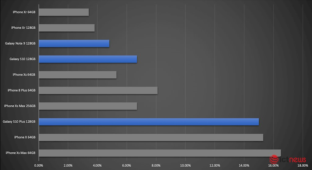 Chiếc S10+ phiên bản 128GB nắm đến 35,9% số lượng máy bán ra ở phân khúc này, “bóp” thị phần iPhone Xs Max 64GB và iPhone X 64GB xuống còn lần lượt 9,4% và 11,5% - mức đáy của hai smartphone chủ lực của Apple.