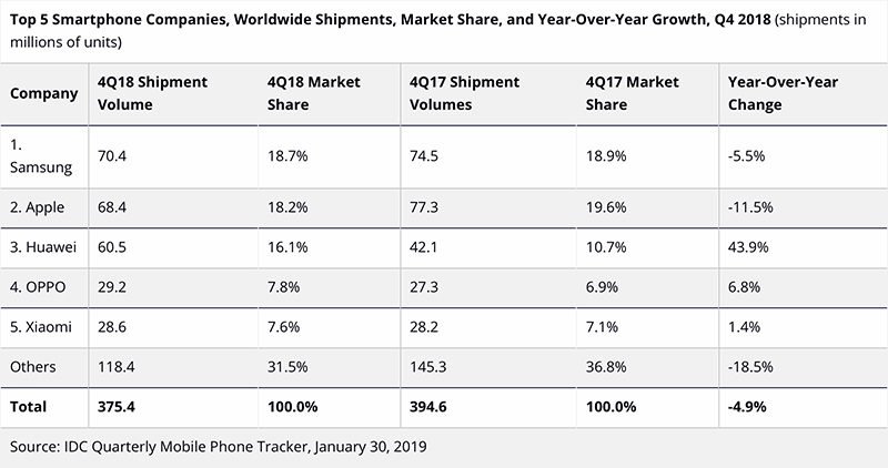 Theo dữ liệu mới nhất của hãng nghiên cứu IDC, Samsung là nhà sản xuất smartphone lớn nhất thế giới trong quý IV/2018, tiếp theo là Apple và Huawei. Báo cáo được IDC đưa ra chỉ một ngày sau khi Apple công bố kết quả kinh doanh trong cùng kỳ. Do Apple không còn cung cấp số liệu iPhone bán ra cụ thể, các nhà phân tích phải đoán xem nó là bao nhiêu.