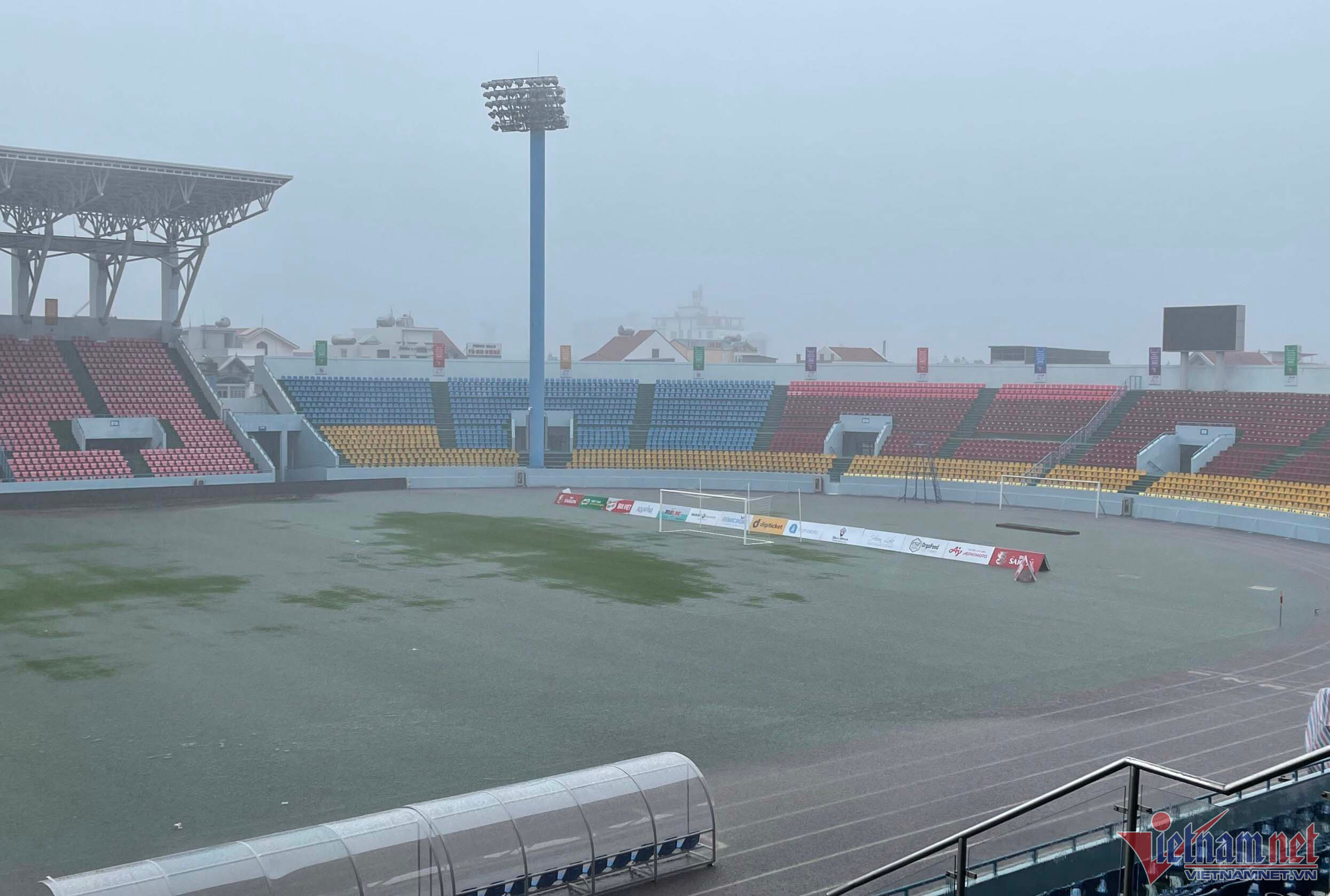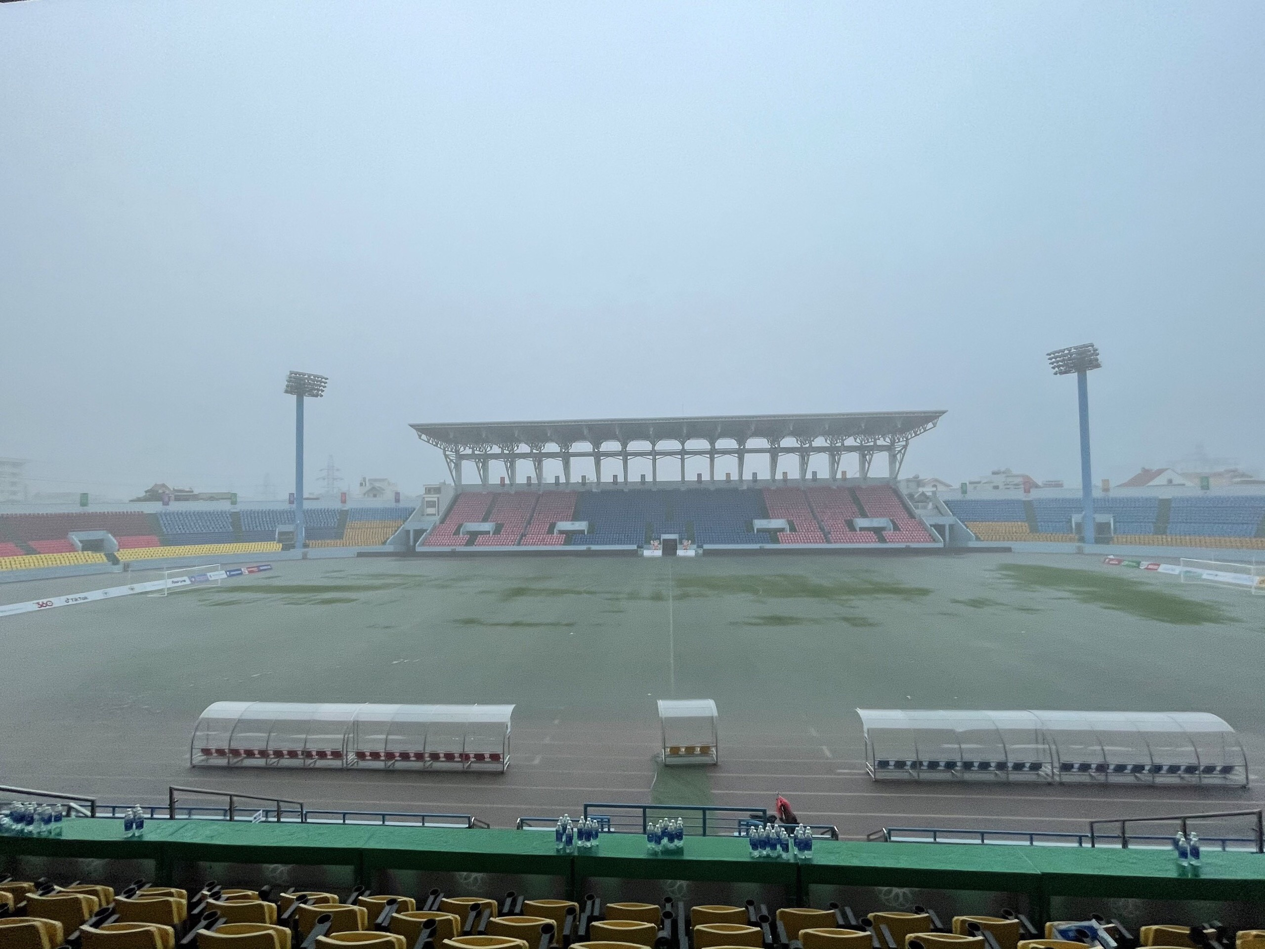 Cơn mưa lớn trong sáng 10/5 đã khiến sân Cẩm Phả ngập khá nặng buộc trận đấu giữa tuyển nữ Myanmar và Lào vào lúc 16h chiều nay (10/5) phải tạm hoãn, không thể lăn bóng đúng giờ.