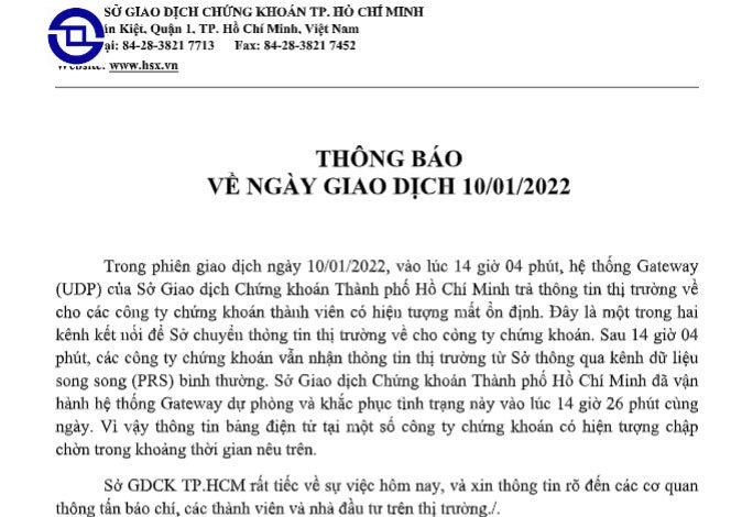 Cụ thể, theo HOSE, trong phiên giao dịch ngày 10/01/2022, vào lúc 14 giờ 04 phút, hệ thống Gateway (UDP) của Sở Giao dịch Chứng khoán Thành phố Hồ Chí Minh trả thông tin thị trường về cho các công ty chứng khoán thành viên có hiện tượng mất ổn định.