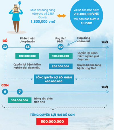 Con trai anh, bé Tuấn, năm lên 7 tuổi bị bỏng sâu trên diện tích nhỏ, cháu nhận quyền lợi bảo hiểm là 50% số tiền bảo hiểm cho quyền lợi bệnh hiểm nghèo. Như vậy tới năm 40 tuổi, hai bố con đã nhận được bồi thường là 500 triệu VND.