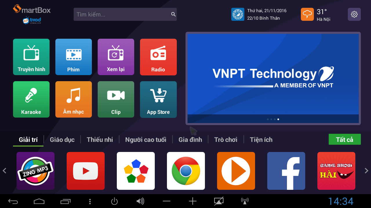 Sản phẩm Smartbox cung cấp kho ứng dụng đa dạng, đáp ứng nhu cầu chung của hộ gia đình cũng như nhu cầu cá nhân hóa của từng thành viên: từ giải trí, mua sắm cho đến tham dự hội thảo, gặp mặt trực tuyến. Đây là thiết bị học tập, giải trí tập trung đồng hành cùng các gia đình Việt Nam, cung cấp công cụ giúp mỗi thành viên nâng cao chất lượng cuộc sống và tối ưu hiệu quả công việc.