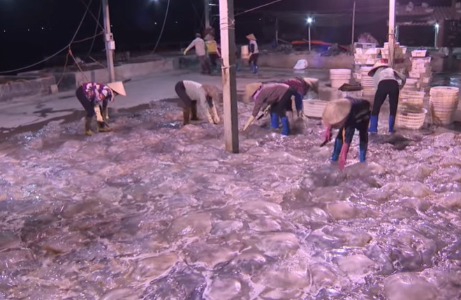 Mùa sứa là những đêm không ngủ của cư dân ven biển Thịnh Long. Thời gian bắt đầu thu hoạch sứa của những ngư dân nơi đây bắt đầu từ 1h sáng.