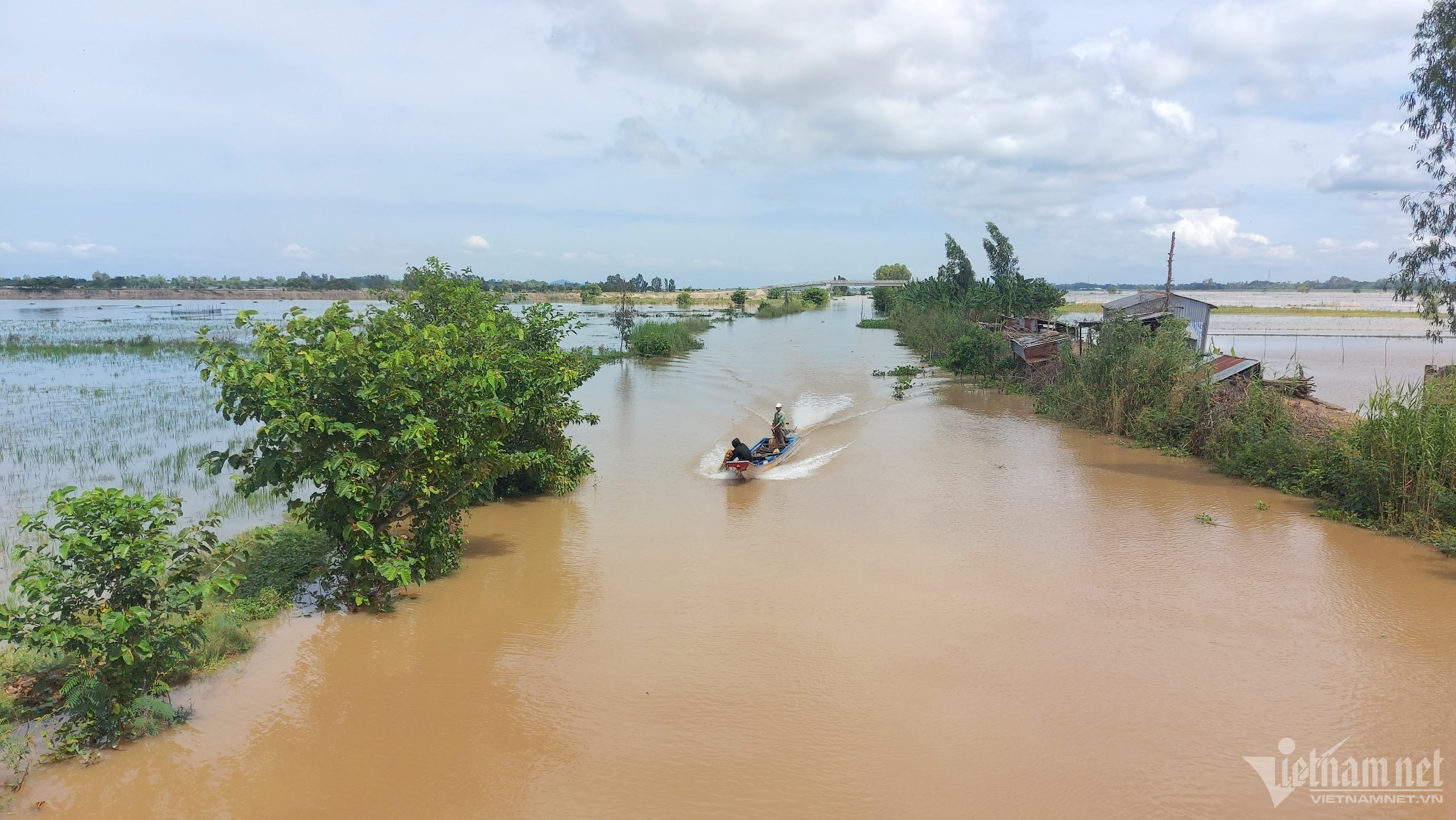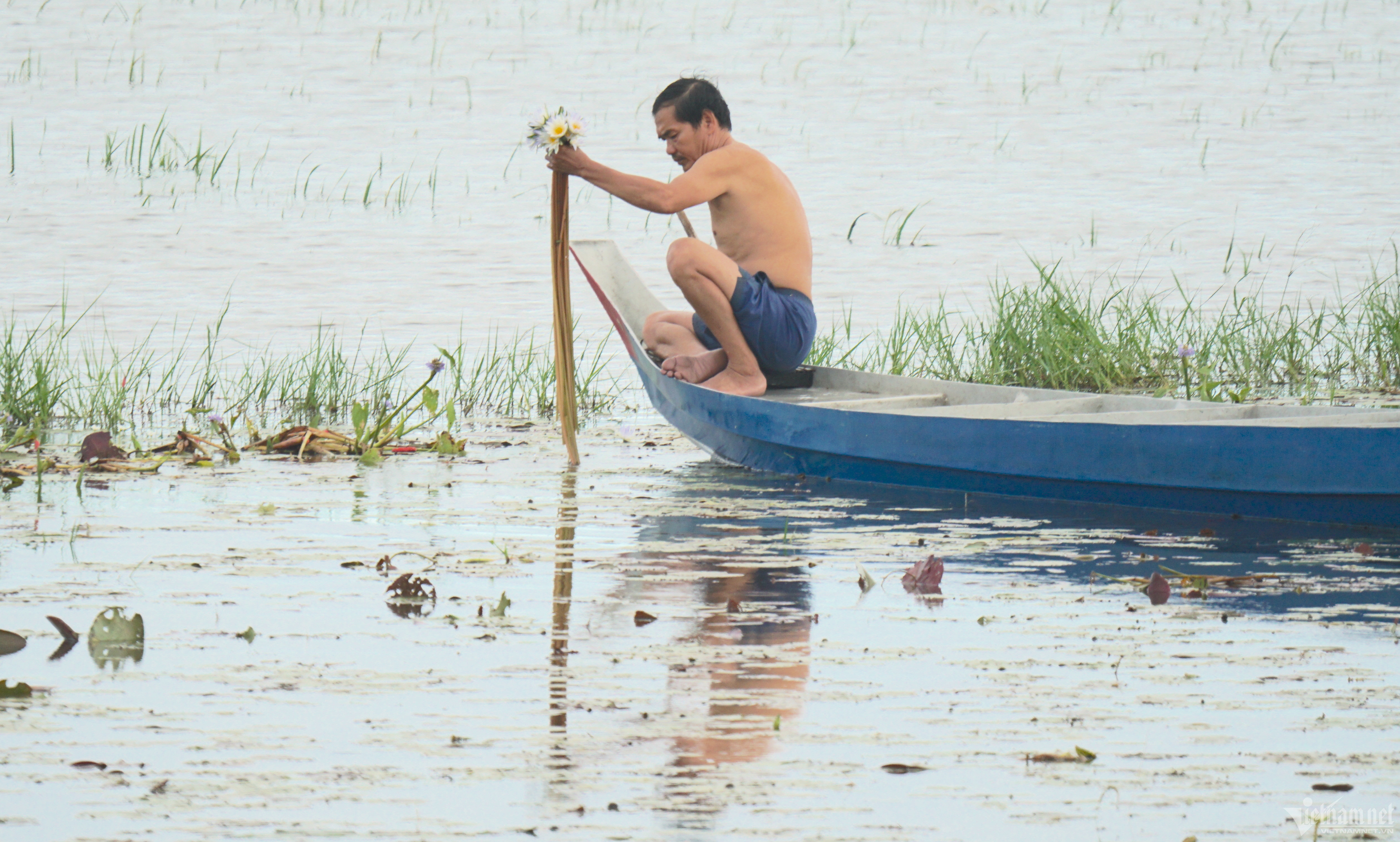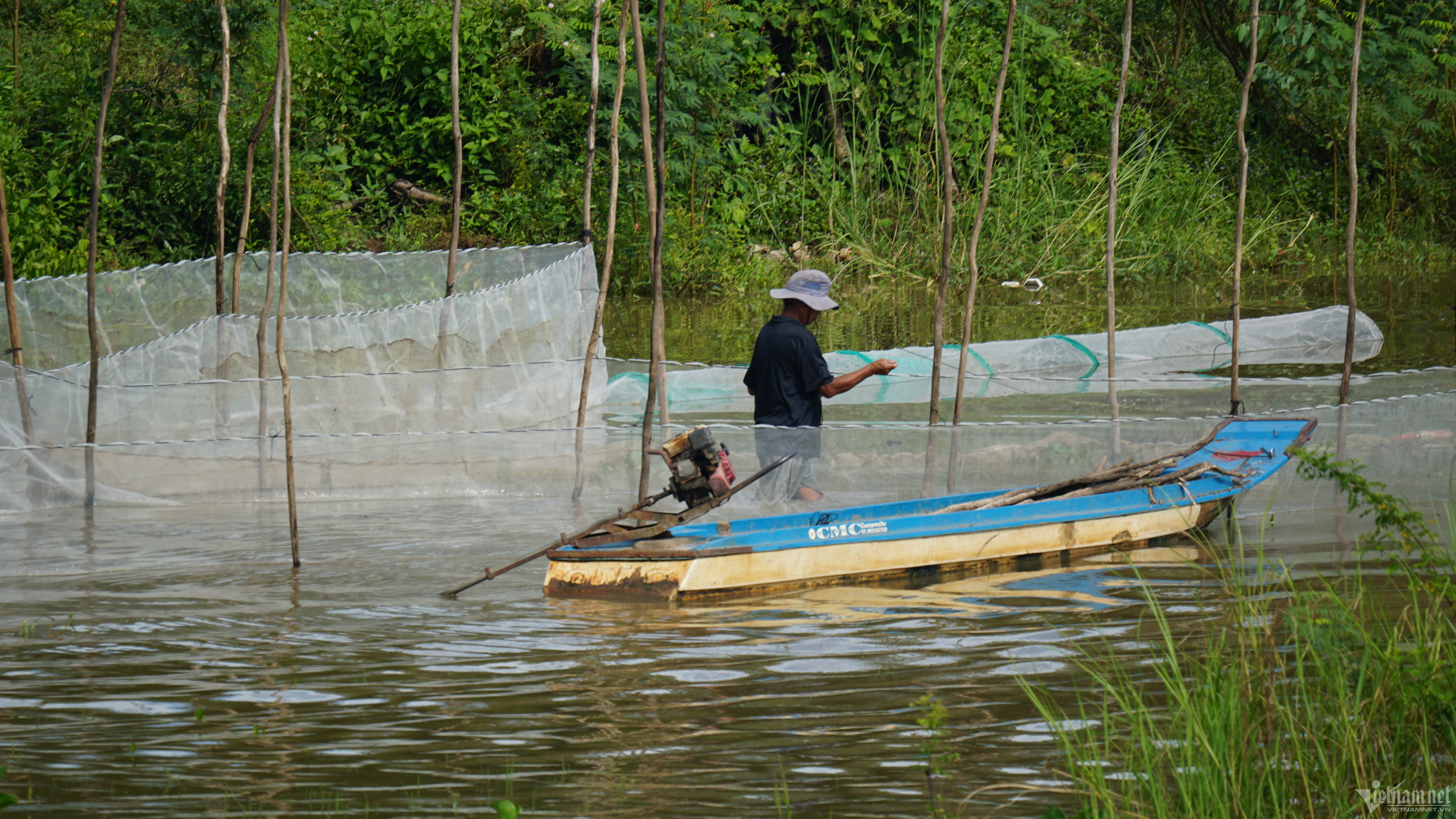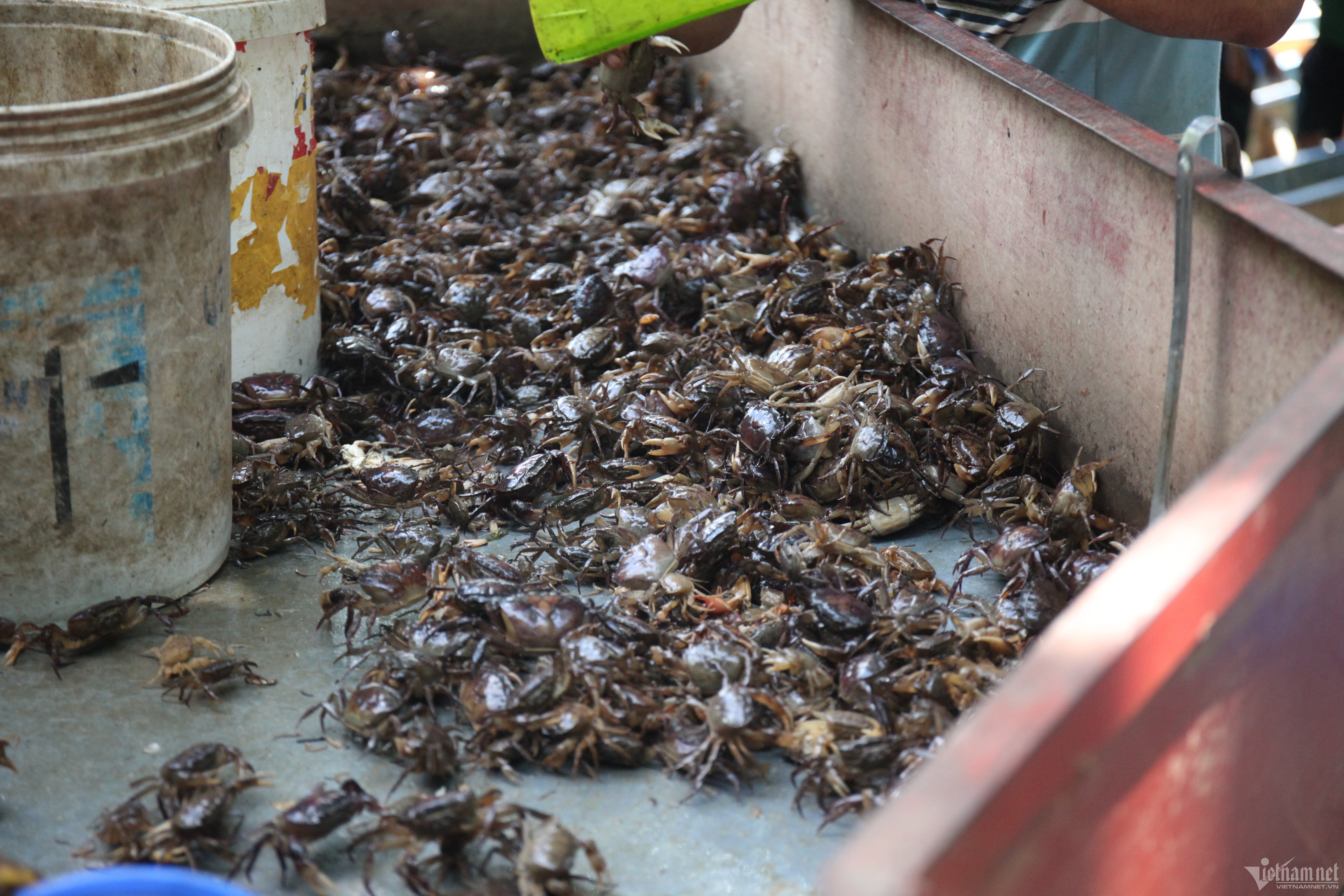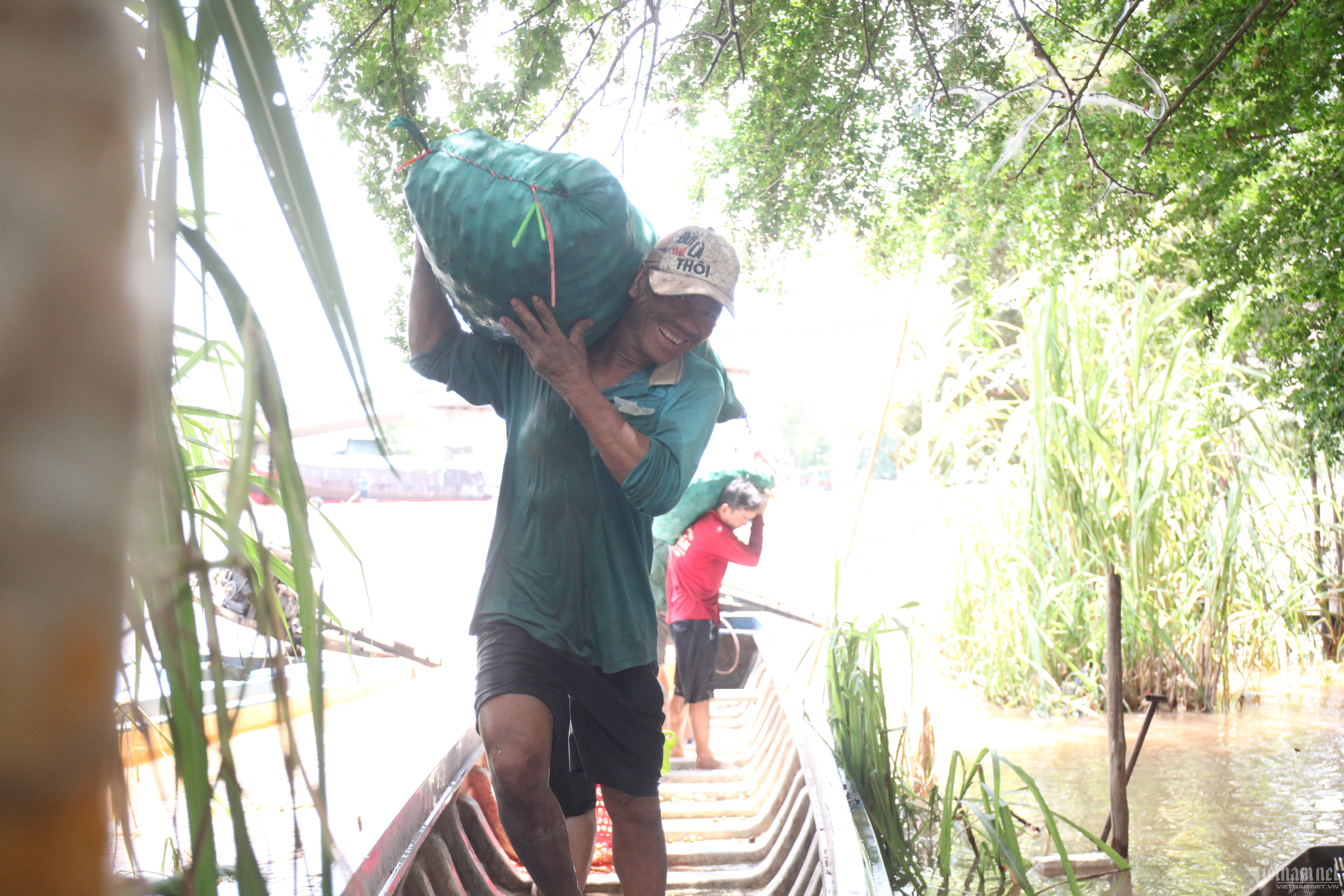 Mùa nước nổi trở thành nét đặc trưng của miền Tây sông nước. Muôn kiểu kiếm tiền, đủ mọi vất vả, song vượt lên tất cả vẫn là niềm vui đón lũ, đón đặc sản về đồng ruộng.Trên những cánh đồng đầu nguồn thuộc huyện An Phú (tỉnh An Giang), khoảng 1 tuần nay bắt đầu đón những con nước tràn đồng. Năm nay, lũ đến thấp và muộn kéo theo sản lượng thuỷ sản đầu nguồn giảm. Thế nhưng, mỗi ngày, ở vùng biên, hàng chục tấn sản vật mùa nước nổi được người dân mua bán, vẫn tạo nên không khí nhộn nhịp.Ghi nhận tại một cơ sở thu mua thuỷ sản tại ấp Bắc Đai (xã Nhơn Hội, huyện An Phú), hàng chục nhân công đang khuôn vác, phân loại, đóng thùng cua, ốc. Dưới sông, thuyền, vỏ lái (một loại thuyền máy hoặc xuồng, ghe nhỏ - PV) chất đầy thuỷ sản đậu san sát chờ đưa lên bờ.Ông Trần Anh Tuấn (71 tuổi), chủ một cơ sở thu mua cho biết, trung bình mỗi ngày ông thu mua khoảng 50 tấn cua, ốc của người dân, trong đó chủ yếu từ Campuchia sang. Sau đó, ông bán cho các mối ở Hà Nội, TP.HCM. Hiện, ốc lác, ốc bươu giá 30.000 đồng/kg, cua đồng giá 15.000 đồng/kg.“Những năm trước tầm tháng 9 nước về cao 2-3m. Năm nay con nước chỉ mới chỉ ngang ngực mà lại lên nhanh nhưng rút cũng nhanh. Chính vì vậy, bà con cũng đánh bắt được ít hơn rất nhiều”, ông Tuấn cho hay.Tại chợ Vĩnh Hội Đông (huyện An Phú) cách biên giới Campuchia hơn 1km, hàng chục vỏ lãi của người dân bên kia biên giới tấp nập cập bờ. Phiên chợ họp nhanh chóng trong vài tiếng đồng hồ lúc tờ mờ sáng và đầu giờ chiều.Đặc sản sông nước cá linh, lươn, cá lóc, rắn... tươi rói vừa cập bờ đã được thương lái thu mua.Đôi vợ chồng làm sạch cá linh ngay trên sông.