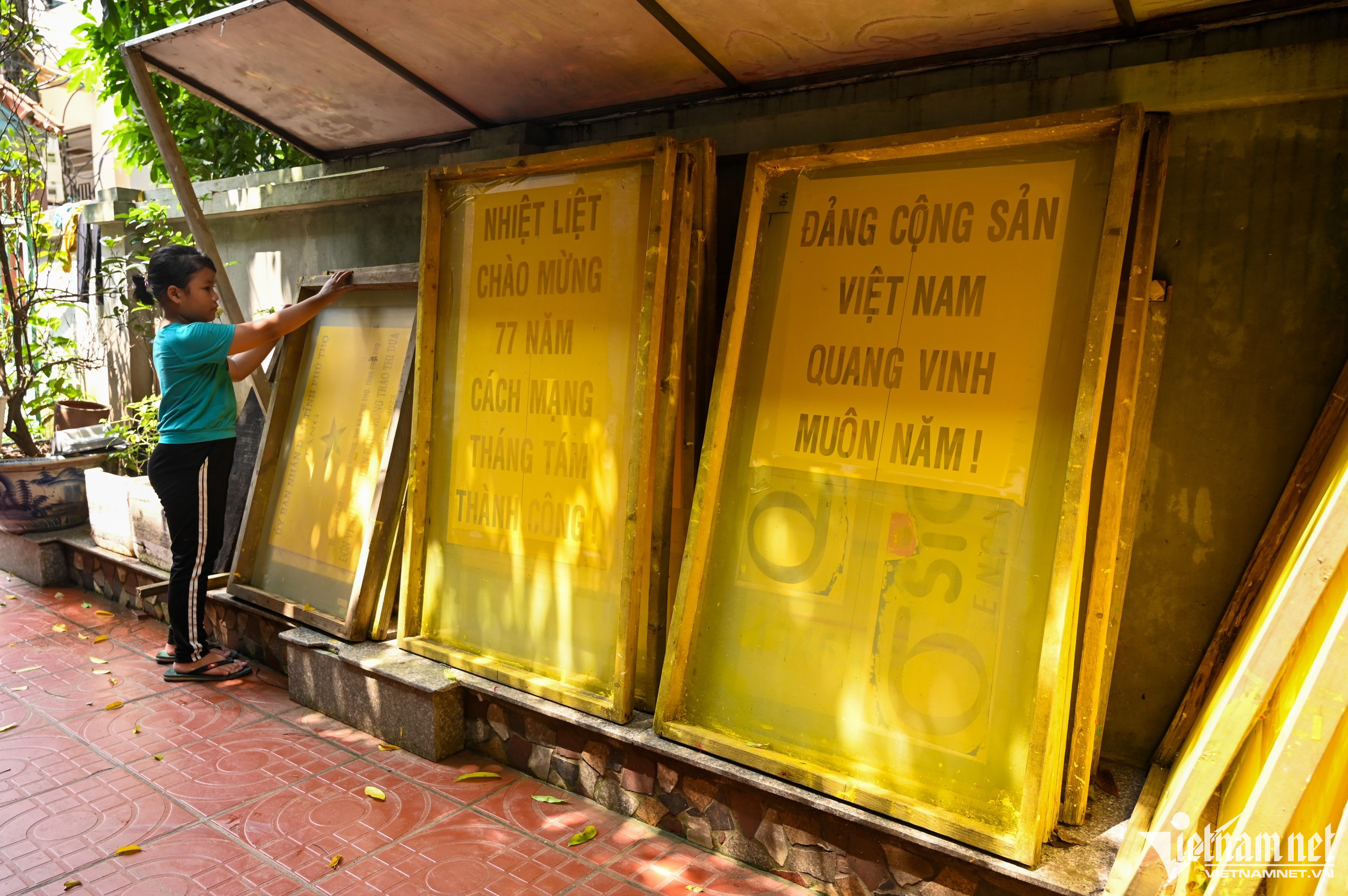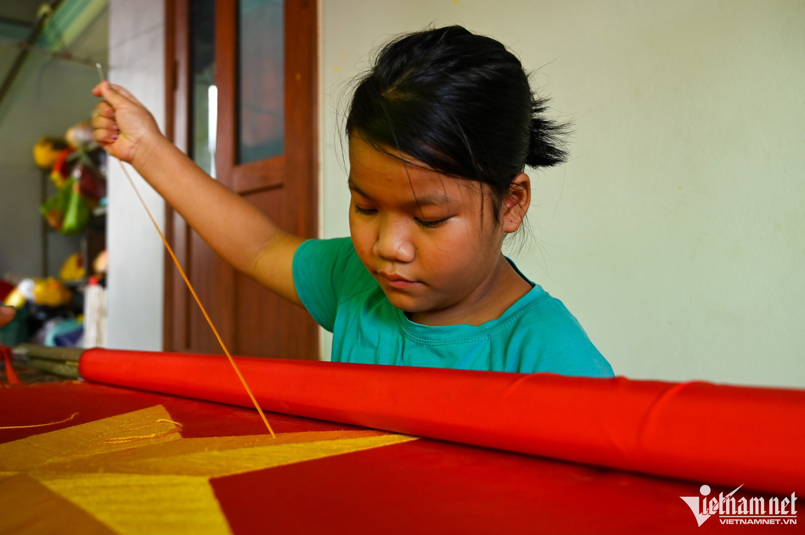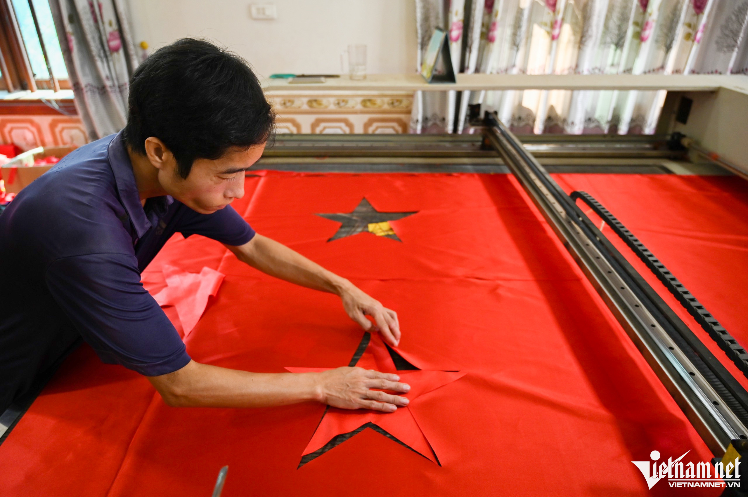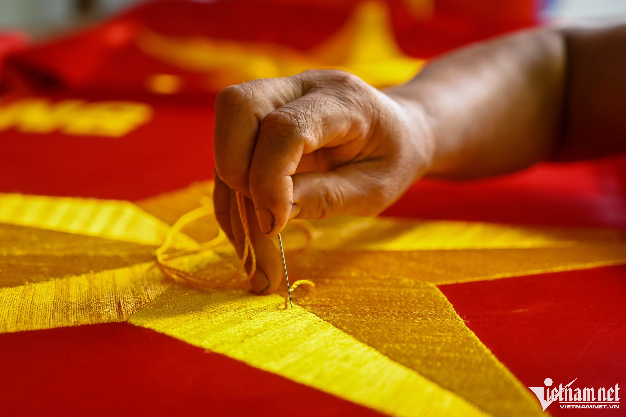 Gia đình chị Vương Thị Nhung ở làng Từ Vân (huyện Thường Tín, Hà Nội) những ngày này tất bật in, thêu cờ Tổ quốc chuẩn bị phục vụ Quốc khánh 2/9. Đây là hộ duy nhất còn lưu giữ nghề này qua nhiều thế hệ.Vào những ngày bình thường số lượng đặt hàng không nhiều với chỉ vài chục đến trăm lá cờ. Dịp Quốc khánh 2/9 số lượng đơn mỗi lúc một tăng, khách đặt trước cả tháng, gia đình chị Nhung lại hối hả hoàn thành để kịp giao cho các cửa hàng và khách lẻ.Với những khách hàng đặt qua email, tin nhắn, cơ sở đều hoàn thiện đúng yêu cầu. Ngoài cờ Tổ quốc, các loại cờ phướn, cờ thưởng, băng rôn, khẩu hiệu cũng được làm nhiều dịp này.Để làm ra một chiếc cờ thêu truyền thống chất lượng, bà chủ cơ sở nhập vải sa từ làng La Khê (quận Hà Đông), chỉ thêu đúng loại của làng Triều Khúc, sợi chỉ mềm, không xù và bóng. Trước đây mọi thứ đều là thủ công, còn hiện giờ đã có máy móc hỗ trợ, một lần cắt có thể cho ra 8 lá cờ to, 21 lá cờ bé.Bà Nguyễn Thị Xếp khẳng định thêu tay thủ công rất vất vả. "30 năm làm nghề này tôi thấy ngồi nhiều đau lưng, mỏi mắt vì giờ cũng có tuổi. Nhưng khi hoàn thiện được một lá cờ tôi lại thấy tự hào vô cùng. Công việc này đòi hỏi người thợ phải có sự tỉ mỉ, nhẫn nại không được nóng vội", bà Xếp nói.Hiện nay, trong làng đã có nhiều hộ gia đình chuyển sang làm bằng máy móc nhưng gia đình chị Nhung vẫn dùng phương pháp thêu thủ công. Bởi vậy, để hoàn thiện một lá cờ chị mất 3 ngày đến gần một tuần, mọi người phải kiên nhẫn ngồi thêu chục tiếng mỗi ngày.Huệ (cháu ruột chị Nhung) cần mẫn trên từng đường kim mũi chỉ để hoàn thiện hình ngôi sao 5 cánh. Huệ biết làm cờ từ năm 9 tuổi. Ngày nào không đi học, em sang đây 3 tiếng để giúp cô thêu.Chị Nhung sử dụng kỹ thuật in thủ công, dùng sơn vàng để in rồi phơi khô. Đây là công đoạn cần sự khéo léo, người thợ chỉ lỡ tay sẽ làm các mảng sơn dính vào nhau, khi cố gỡ ra cờ dễ bị nhem nhuốc, không đạt chất lượng. Vào những ngày trời mưa, độ ẩm cao họ phải dùng máy sấy, còn phơi nắng thì khoảng 30 phút là cờ khô.Sau khi in xong bàn in được rửa sạch và phơi khô để hôm sau có thể tiếp tục sản phẩm mới.Bàn in được thiết kế sẵn với những khẩu hiệu tuyên truyền thường dùng vào dịp đặc biệt. Việc này sẽ rút ngắn thời gian của người thợ trong việc nhận và giao hàng.