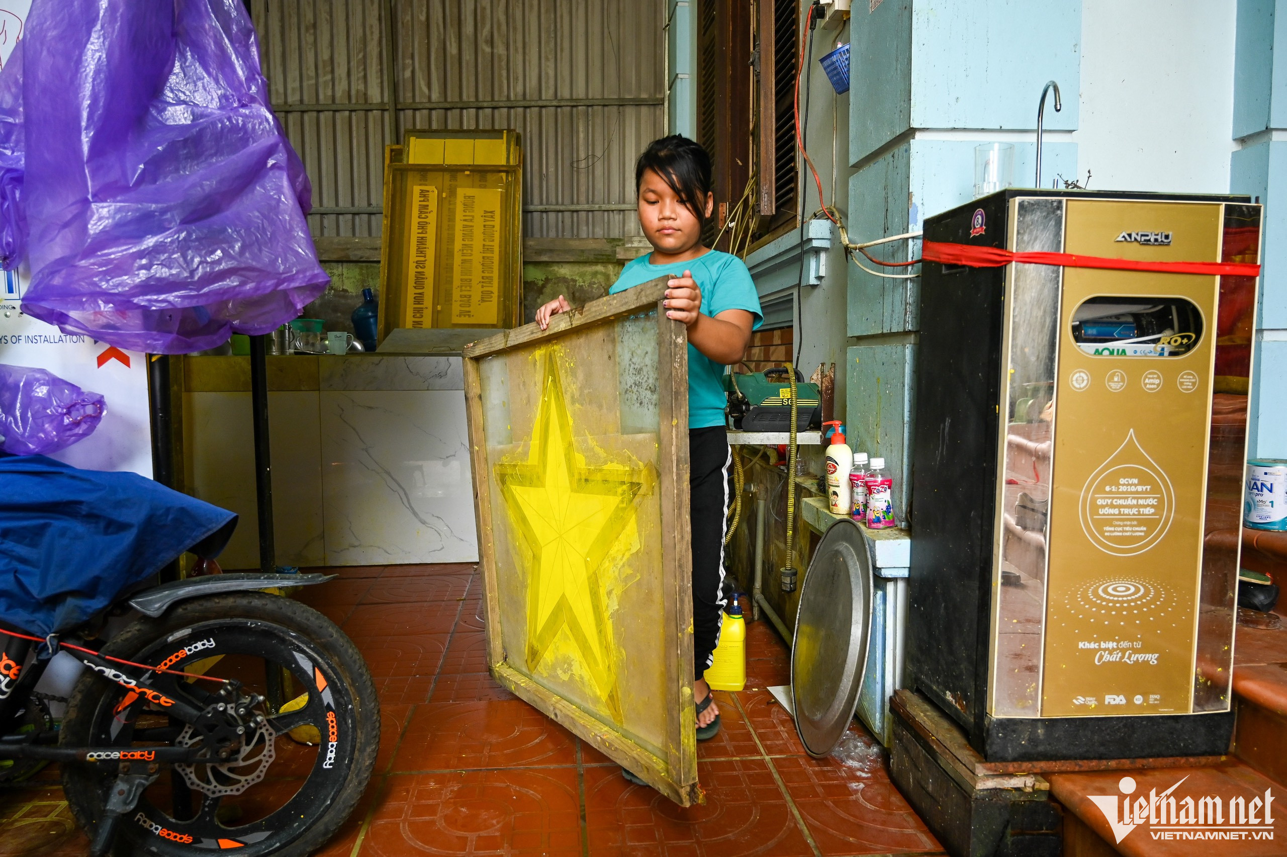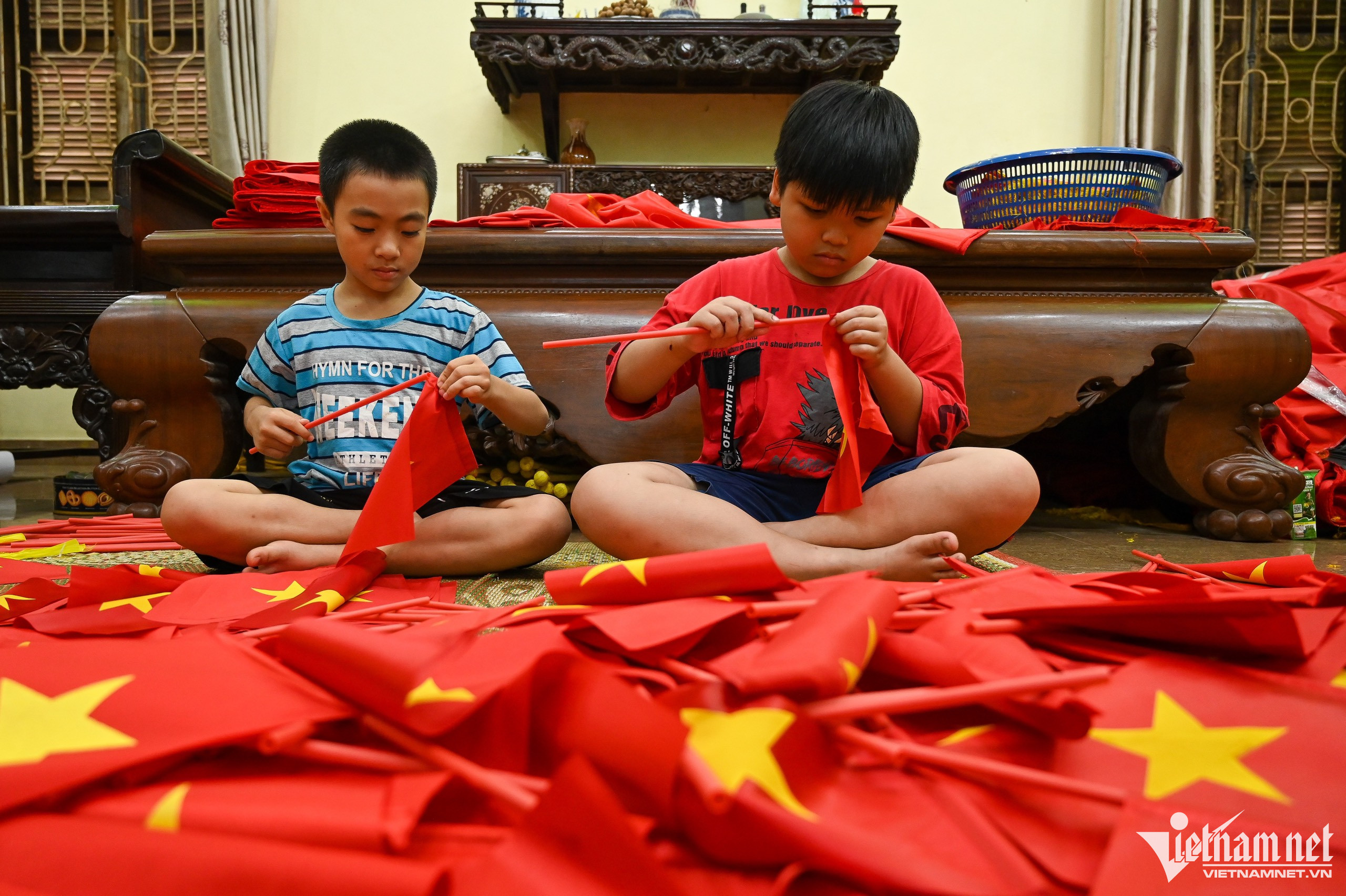 Đức Huy và Đặng Nghĩa hào hứng hoàn thiện những lá cờ nhỏ để phục vụ lễ khai giảng sắp tới. Dịp này, gia đình chị Nhung sản xuất hơn chục nghìn lá cờ nhỏ, mỗi chiếc giá 5.000-6.000 đồng, còn cờ to từ 10.000-15.000 đồng.