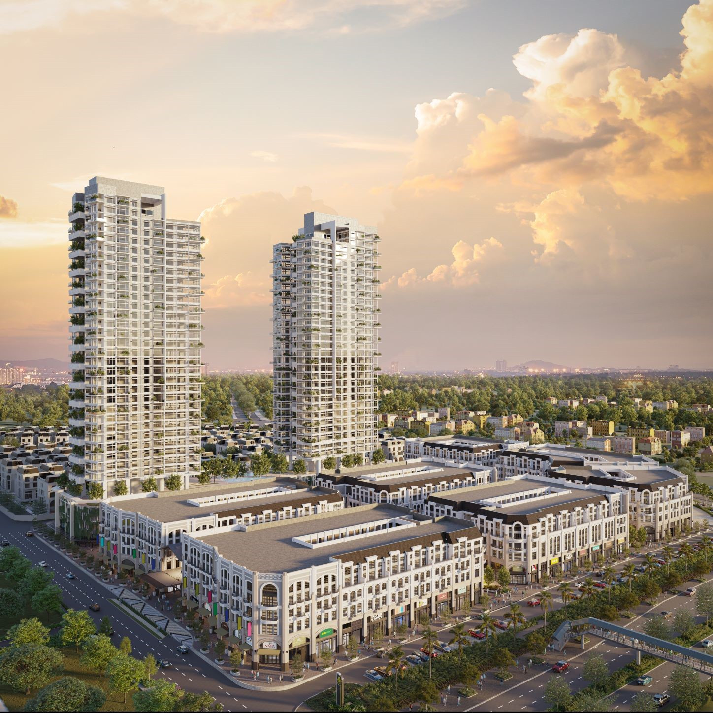 Khu phức hợp có quy mô 6 khối nhà gồm 92 căn. Mỗi căn có thiết kế 5 tầng với lối vào riêng biệt và 1 tầng hầm chung. Theo đó, hai tầng thương mại phù hợp kinh doanh - làm văn phòng. Tầng 1 sở hữu 2 mặt tiền, phía trước hướng ra đường lớn, phố đi bộ ngoài trời, quảng trường sự kiện. Mặt sau giáp phố đi bộ trong nhà có mái kính che, điều hòa. Đây được đánh giá là thiết kế đắc địa, hưởng trọn sự sầm uất trong không gian. Với chiều cao thông tầng 7 mét, mặt tiền rộng tới 8,1 mét rất thích hợp cho các thương hiệu khoe trọn đẳng cấp.