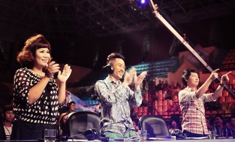Hội đồng nghệ thuật đứng lên sau màn biểu diễn của Đông Hùng. |