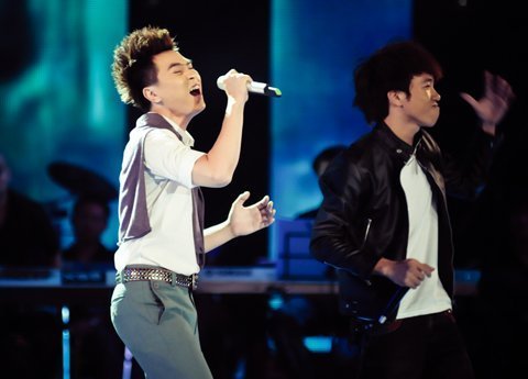 Trung Quân (áo đỏ) và Phú Quý (áo trắng) hồi hộp nghe công bố kết quả. |