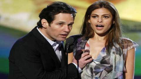 Sau đó Paul Rudd cũng hành động, một tay ôm eo Eva Mendes và tay phải thản nhiên sờ ngực của nữ diễn viên nổi tiếng này trước sự chứng kiến của đông đảo khán giả tại lễ trao giải.