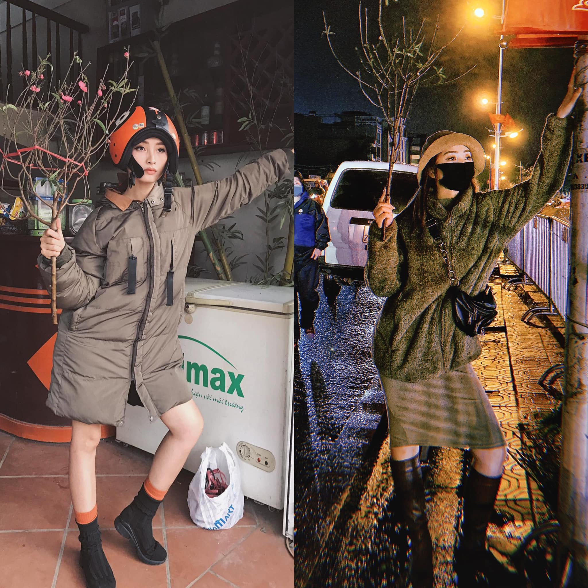 MC Mù Tạt tạo dáng hài hước với cành đào. Cô không quên thả thính: “Tết này vẫn giống Tết xưa/ Ước gì năm mới ai cưa Trang nhỉ".