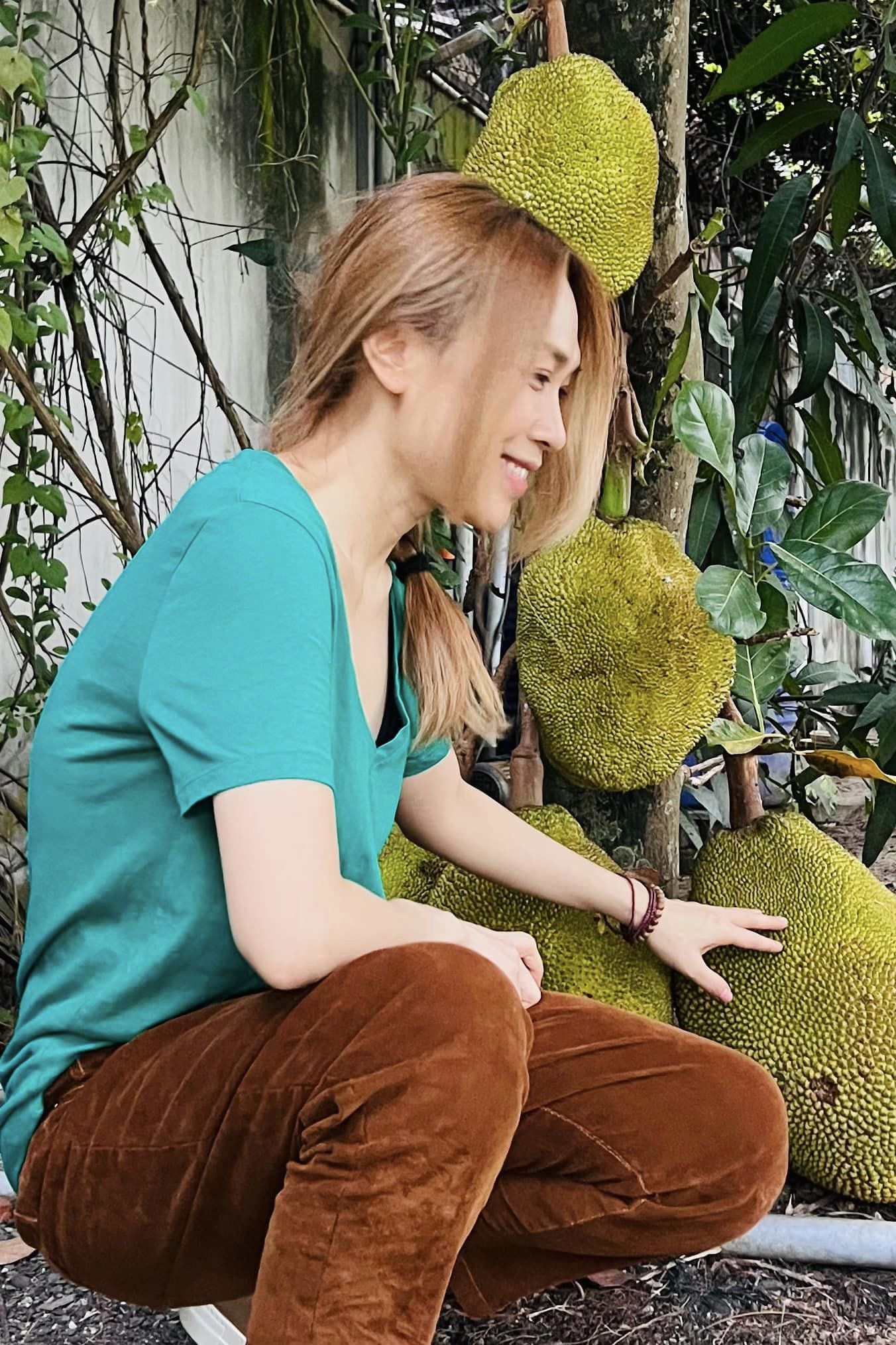 Ca sĩ Mỹ Tâm mặc giản dị ra vườn hái mít.
