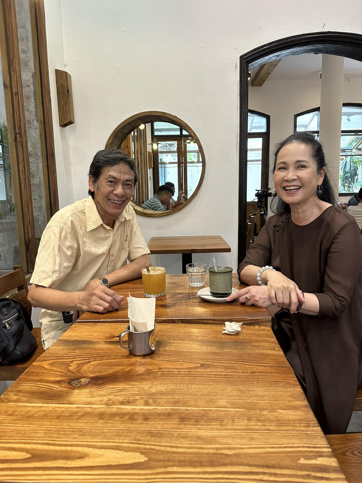 NSND Lan Hương đăng ảnh đi uống cà phê vui vẻ cùng NSND Bùi Bài Bình - ông chồng trong 'Gia đình mình vui bất thình lình'.
