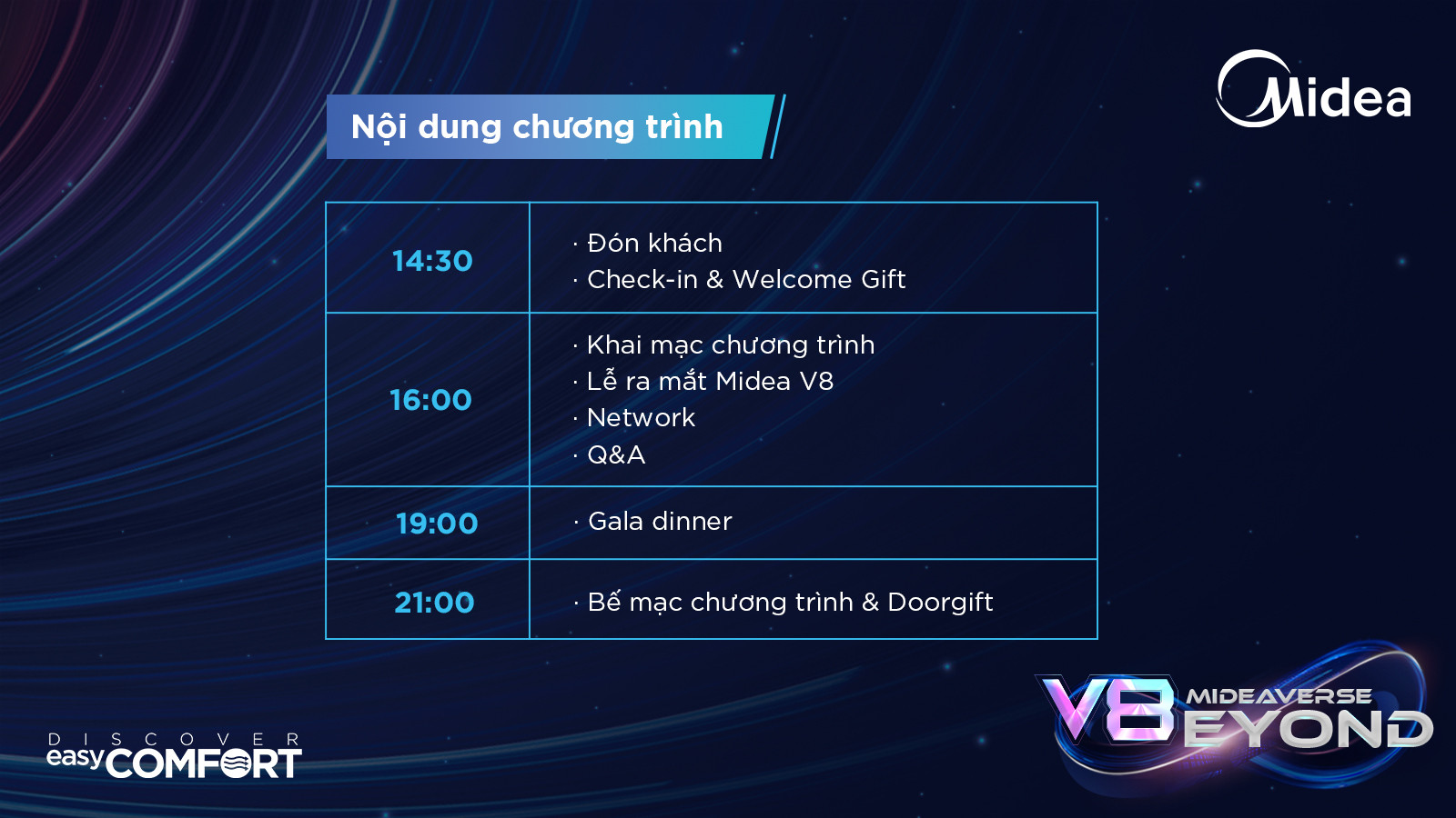 Với chủ đề “Mideaverse Beyond", sự kiện ra mắt tại Việt Nam của Midea sẽ mang đến mẫu Midea V8 với 2 phiên bản V8 Master Series và V8X Pro Series với khả năng giải quyết các vấn đề trong ngành điều hòa không khí ở thời điểm hiện tại bằng những công nghệ tiên tiến hàng đầu, góp phần mang lại sự đổi mới kỹ thuật đột phá cho thị trường Điều hòa trung tâm tại Việt Nam.