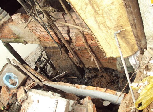 | Căn liền kề bị nứt đôi có thể sụp bất cứ lúc nào (Ảnh: Trần Chánh Nghĩa) |